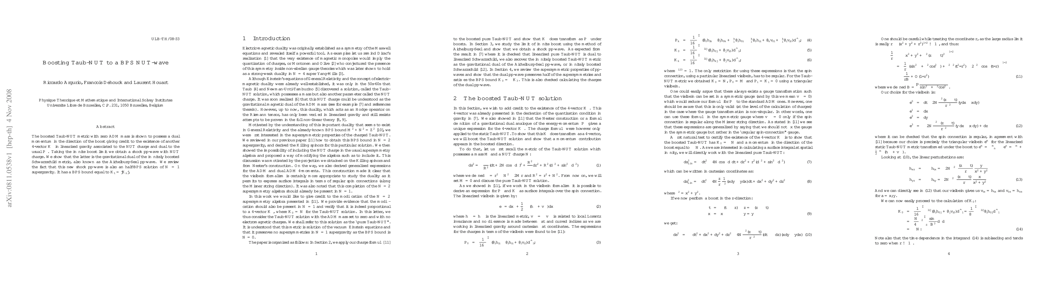 The paper demonstrates that the boosted Taub-NUT metric, when taken to an infinite boost limit, transforms into a shock pp-wave with NUT charge, which is the gravitational dual of the Aichelburg-Sexl metric. This new shock pp-wave is identified as a half-BPS solution in N=1 supergravity with a BPS bound.