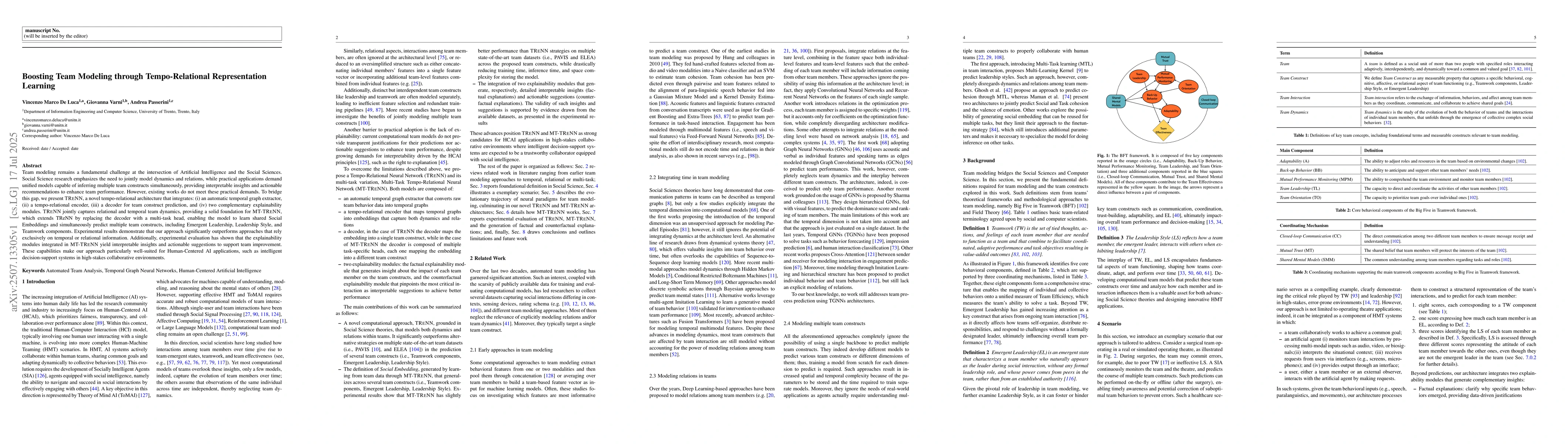 Team modeling remains a fundamental challenge at the intersection of Artificial Intelligence and the Social Sciences. Social Science research emphasizes the need to jointly model dynamics and relations, while practical applications demand unified models capable of inferring multiple team constructs simultaneously, providing interpretable insights and actionable recommendations to enhance team performance. However, existing works do not meet these practical demands. To bridge this gap, we present TRENN, a novel tempo-relational architecture that integrates: (i) an automatic temporal graph extractor, (ii) a tempo-relational encoder, (iii) a decoder for team construct prediction, and (iv) two complementary explainability modules. TRENN jointly captures relational and temporal team dynamics, providing a solid foundation for MT-TRENN, which extends TReNN by replacing the decoder with a multi-task head, enabling the model to learn shared Social Embeddings and simultaneously predict multiple team constructs, including Emergent Leadership, Leadership Style, and Teamwork components. Experimental results demonstrate that our approach significantly outperforms approaches that rely exclusively on temporal or relational information. Additionally, experimental evaluation has shown that the explainability modules integrated in MT-TRENN yield interpretable insights and actionable suggestions to support team improvement. These capabilities make our approach particularly well-suited for Human-Centered AI applications, such as intelligent decision-support systems in high-stakes collaborative environments.