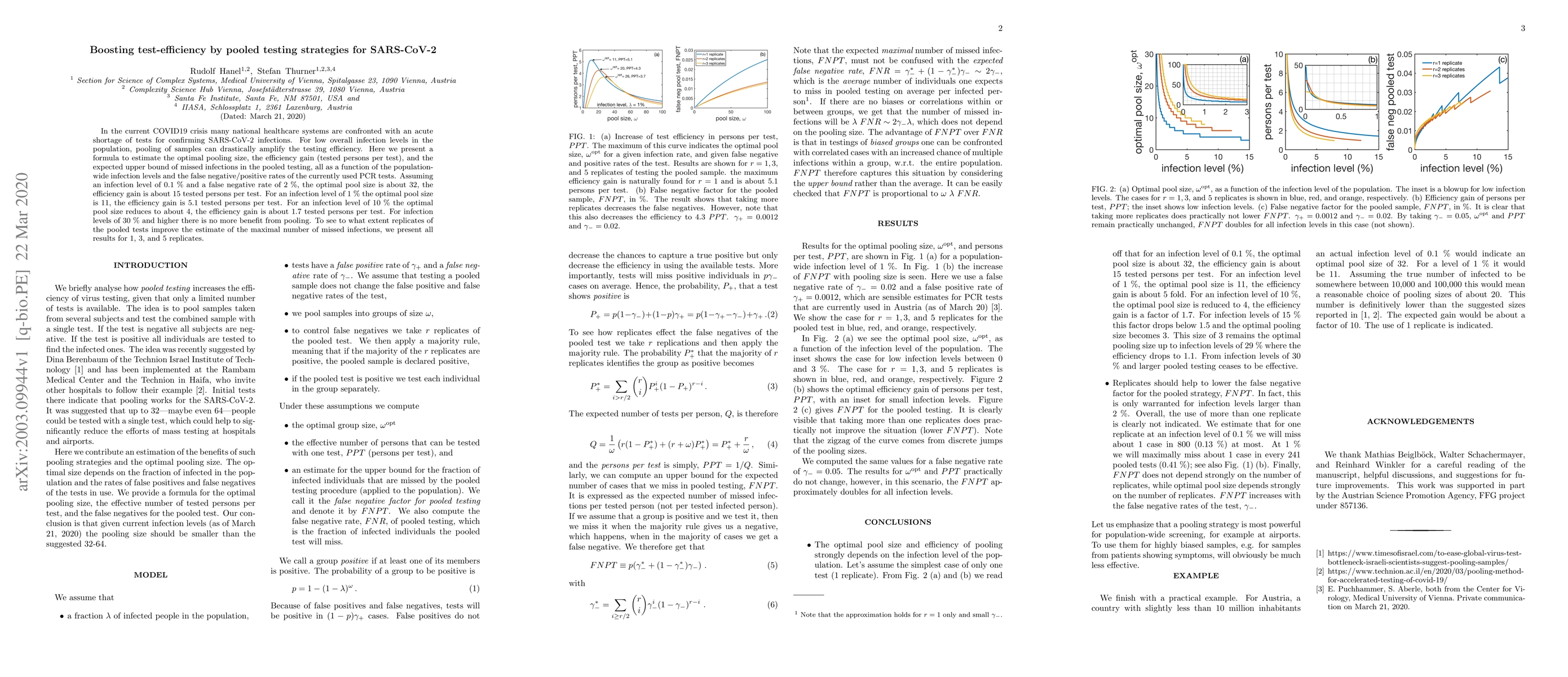 This paper proposes pooled testing strategies to enhance SARS-CoV-2 testing efficiency amid shortages, presenting a formula to determine optimal pooling size and efficiency gains based on infection levels and test error rates. For low infection levels, pooling significantly increases efficiency, but benefits diminish as infection rates rise.