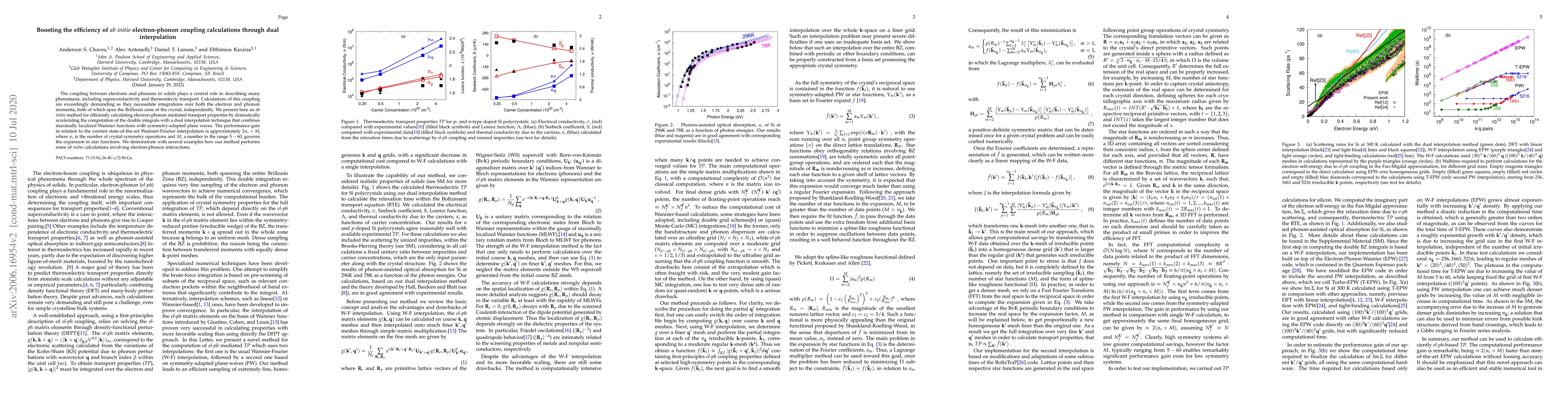 The paper introduces a dual interpolation technique combining maximally localized Wannier functions with symmetry-adapted plane waves to significantly speed up ab initio calculations of electron-phonon coupling, achieving performance gains up to 2n_s × M compared to the current state-of-the-art method. The proposed method effectively accelerates the computation of double integrals over electron and phonon momenta in solids.
