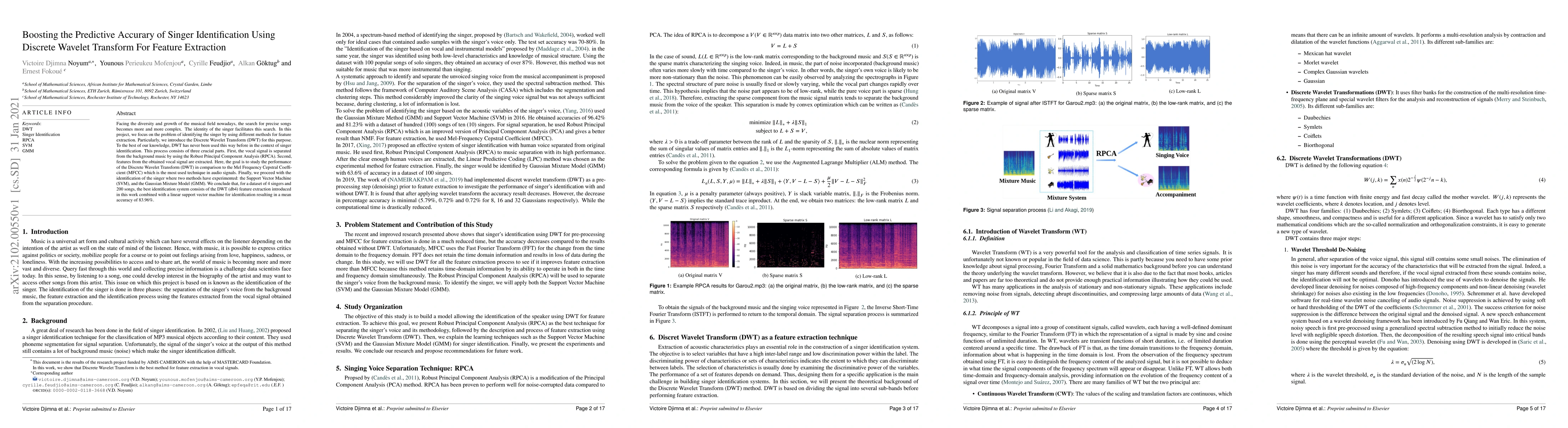 Facing the diversity and growth of the musical field nowadays, the search for precise songs becomes more and more complex. The identity of the singer facilitates this search. In this project, we focus on the problem of identifying the singer by using different methods for feature extraction. Particularly, we introduce the Discrete Wavelet Transform (DWT) for this purpose. To the best of our knowledge, DWT has never been used this way before in the context of singer identification. This process consists of three crucial parts. First, the vocal signal is separated from the background music by using the Robust Principal Component Analysis (RPCA). Second, features from the obtained vocal signal are extracted. Here, the goal is to study the performance of the Discrete Wavelet Transform (DWT) in comparison to the Mel Frequency Cepstral Coefficient (MFCC) which is the most used technique in audio signals. Finally, we proceed with the identification of the singer where two methods have experimented: the Support Vector Machine (SVM), and the Gaussian Mixture Model (GMM). We conclude that, for a dataset of 4 singers and 200 songs, the best identification system consists of the DWT (db4) feature extraction introduced in this work combined with a linear support vector machine for identification resulting in a mean accuracy of 83.96%.