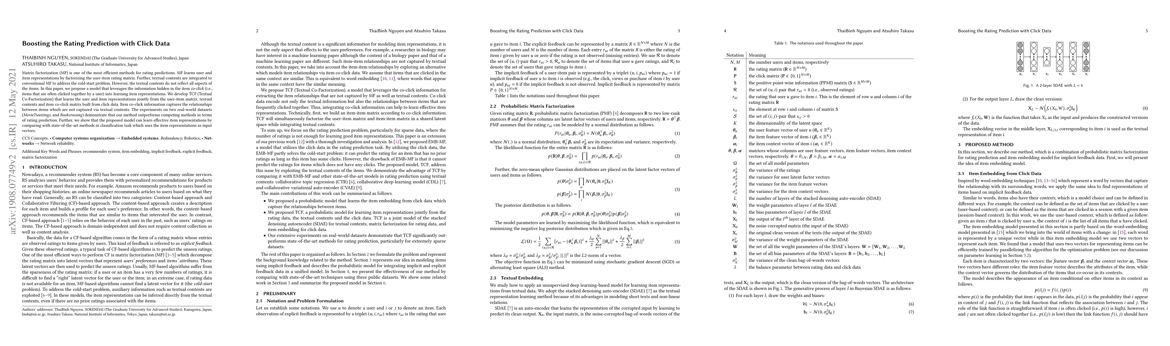 This paper proposes TCMF, a model that integrates textual contents and item co-click data to enhance rating prediction. TCMF jointly learns user and item representations from user-item matrices, textual contents, and item co-click matrices, capturing relationships not reflected in textual data, and outperforms existing methods on real-world datasets.