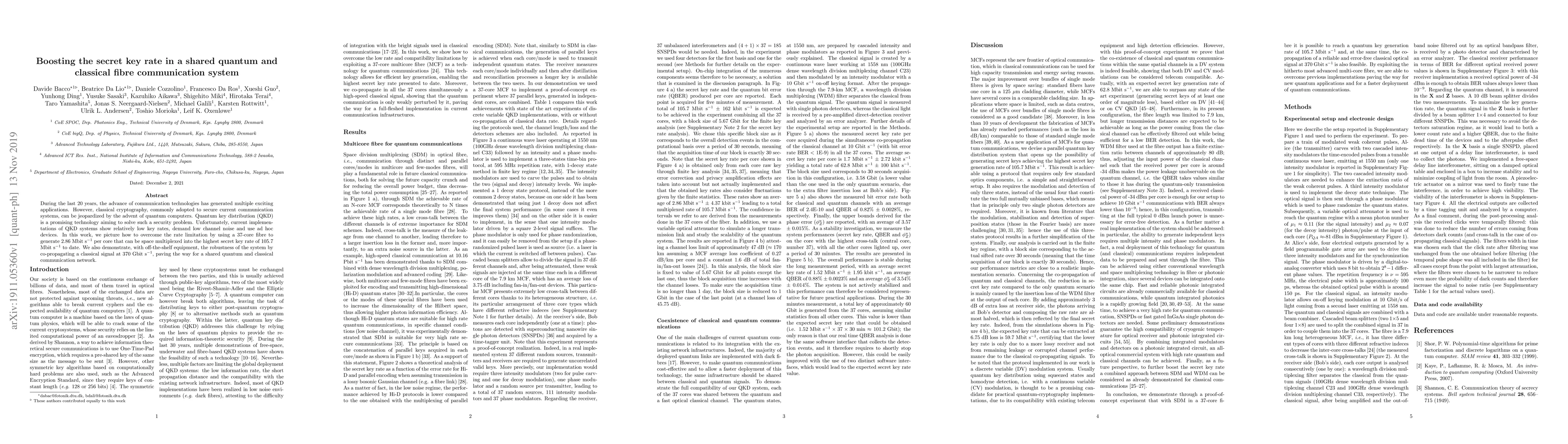 This paper proposes a method to significantly boost the secret key rate in quantum key distribution (QKD) systems using a 37-core fibre to achieve a record-high rate of 105.7 Mbit/s. It also demonstrates the system's robustness by co-propagating a high-speed classical signal, enabling a shared quantum and classical fibre communication network.
