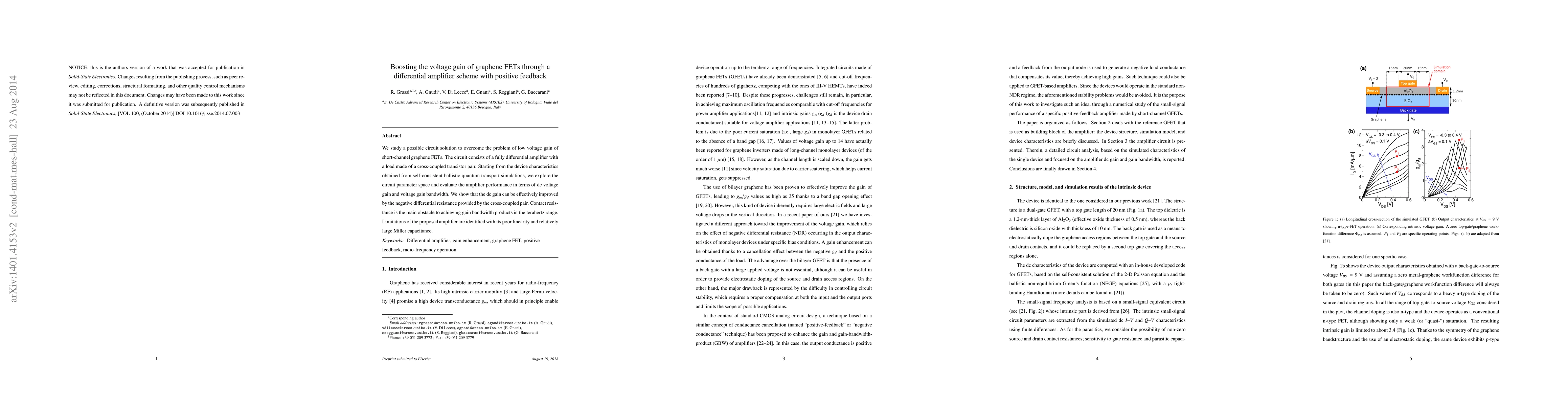 This paper proposes a differential amplifier scheme with positive feedback to enhance the voltage gain of short-channel graphene FETs. The circuit utilizes a cross-coupled transistor pair to achieve improved dc gain, though contact resistance and linearity issues limit its performance.