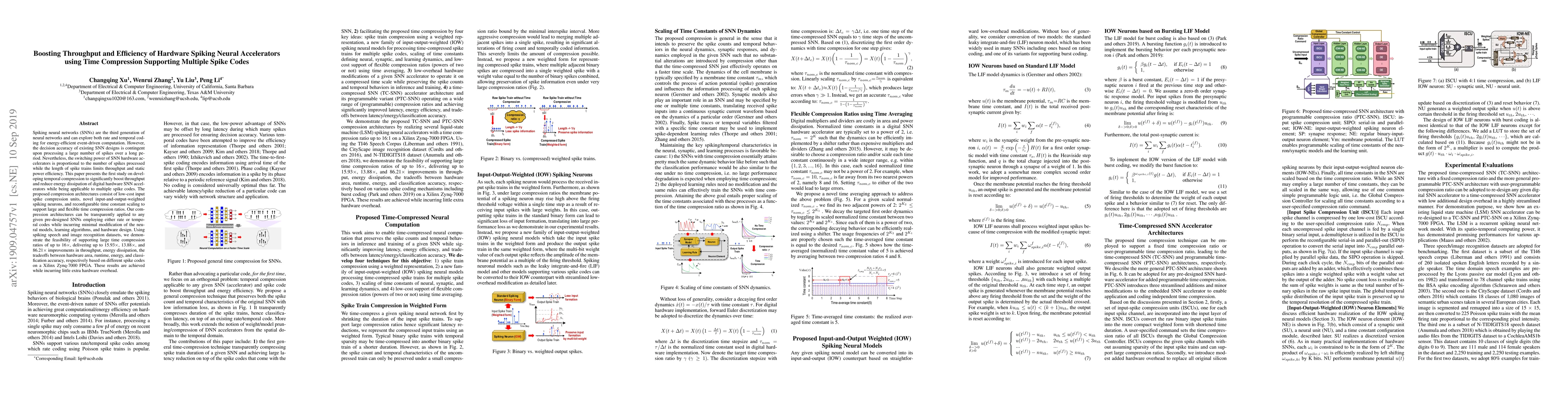 Spiking neural networks (SNNs) are the third generation of neural networks and can explore both rate and temporal coding for energy-efficient event-driven computation. However, the decision accuracy of existing SNN designs is contingent upon processing a large number of spikes over a long period. Nevertheless, the switching power of SNN hardware accelerators is proportional to the number of spikes processed while the length of spike trains limits throughput and static power efficiency. This paper presents the first study on developing temporal compression to significantly boost throughput and reduce energy dissipation of digital hardware SNN accelerators while being applicable to multiple spike codes. The proposed compression architectures consist of low-cost input spike compression units, novel input-and-output-weighted spiking neurons, and reconfigurable time constant scaling to support large and flexible time compression ratios. Our compression architectures can be transparently applied to any given pre-designed SNNs employing either rate or temporal codes while incurring minimal modification of the neural models, learning algorithms, and hardware design. Using spiking speech and image recognition datasets, we demonstrate the feasibility of supporting large time compression ratios of up to 16x, delivering up to 15.93x, 13.88x, and 86.21x improvements in throughput, energy dissipation, the tradeoffs between hardware area, runtime, energy, and classification accuracy, respectively based on different spike codes on a Xilinx Zynq-7000 FPGA. These results are achieved while incurring little extra hardware overhead.