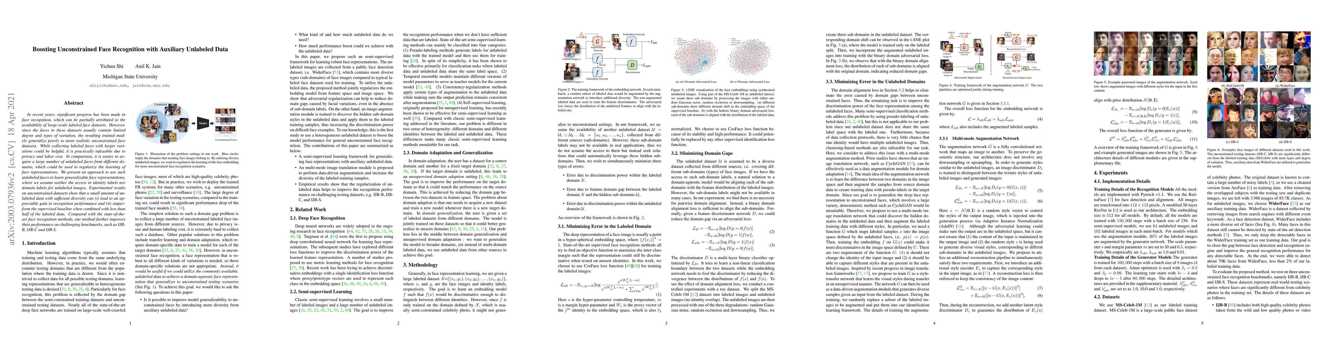 In recent years, significant progress has been made in face recognition, which can be partially attributed to the availability of large-scale labeled face datasets. However, since the faces in these datasets usually contain limited degree and types of variation, the resulting trained models generalize poorly to more realistic unconstrained face datasets. While collecting labeled faces with larger variations could be helpful, it is practically infeasible due to privacy and labor cost. In comparison, it is easier to acquire a large number of unlabeled faces from different domains, which could be used to regularize the learning of face representations. We present an approach to use such unlabeled faces to learn generalizable face representations, where we assume neither the access to identity labels nor domain labels for unlabeled images. Experimental results on unconstrained datasets show that a small amount of unlabeled data with sufficient diversity can (i) lead to an appreciable gain in recognition performance and (ii) outperform the supervised baseline when combined with less than half of the labeled data. Compared with the state-of-the-art face recognition methods, our method further improves their performance on challenging benchmarks, such as IJB-B, IJB-C and IJB-S.
