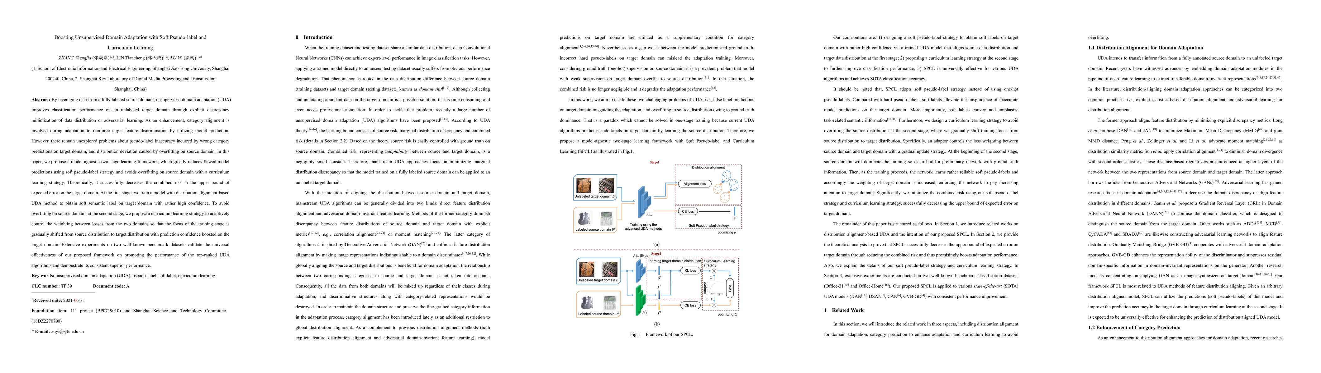 By leveraging data from a fully labeled source domain, unsupervised domain adaptation (UDA) improves classification performance on an unlabeled target domain through explicit discrepancy minimization of data distribution or adversarial learning. As an enhancement, category alignment is involved during adaptation to reinforce target feature discrimination by utilizing model prediction. However, there remain unexplored problems about pseudo-label inaccuracy incurred by wrong category predictions on target domain, and distribution deviation caused by overfitting on source domain. In this paper, we propose a model-agnostic two-stage learning framework, which greatly reduces flawed model predictions using soft pseudo-label strategy and avoids overfitting on source domain with a curriculum learning strategy. Theoretically, it successfully decreases the combined risk in the upper bound of expected error on the target domain. At the first stage, we train a model with distribution alignment-based UDA method to obtain soft semantic label on target domain with rather high confidence. To avoid overfitting on source domain, at the second stage, we propose a curriculum learning strategy to adaptively control the weighting between losses from the two domains so that the focus of the training stage is gradually shifted from source distribution to target distribution with prediction confidence boosted on the target domain. Extensive experiments on two well-known benchmark datasets validate the universal effectiveness of our proposed framework on promoting the performance of the top-ranked UDA algorithms and demonstrate its consistent superior performance.