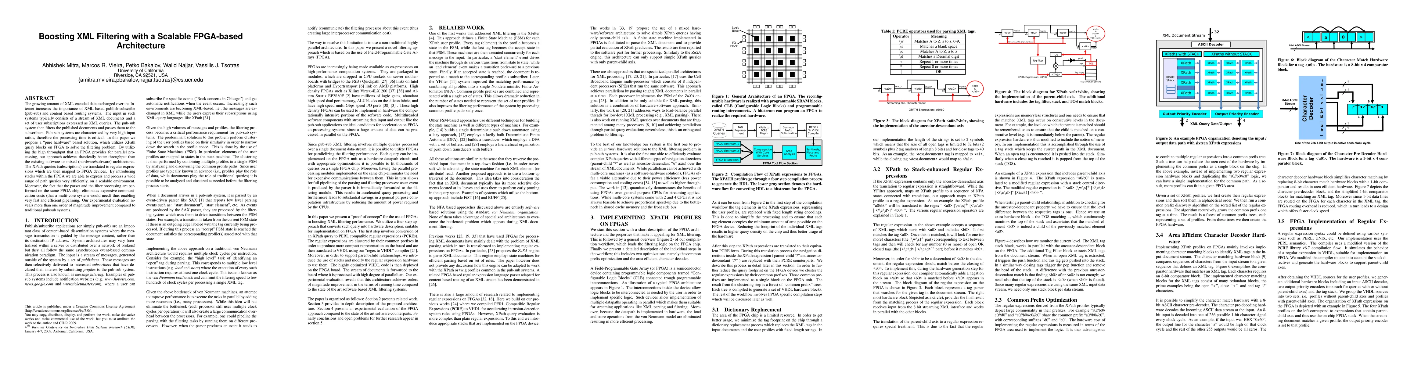 This paper proposes an FPGA-based architecture for XML filtering in publish-subscribe systems, achieving significantly higher throughput than software or mixed architectures by leveraging parallel processing and eliminating inter-processor communication costs. The approach translates XPath queries to regular expressions and maps them onto FPGA devices for efficient execution.