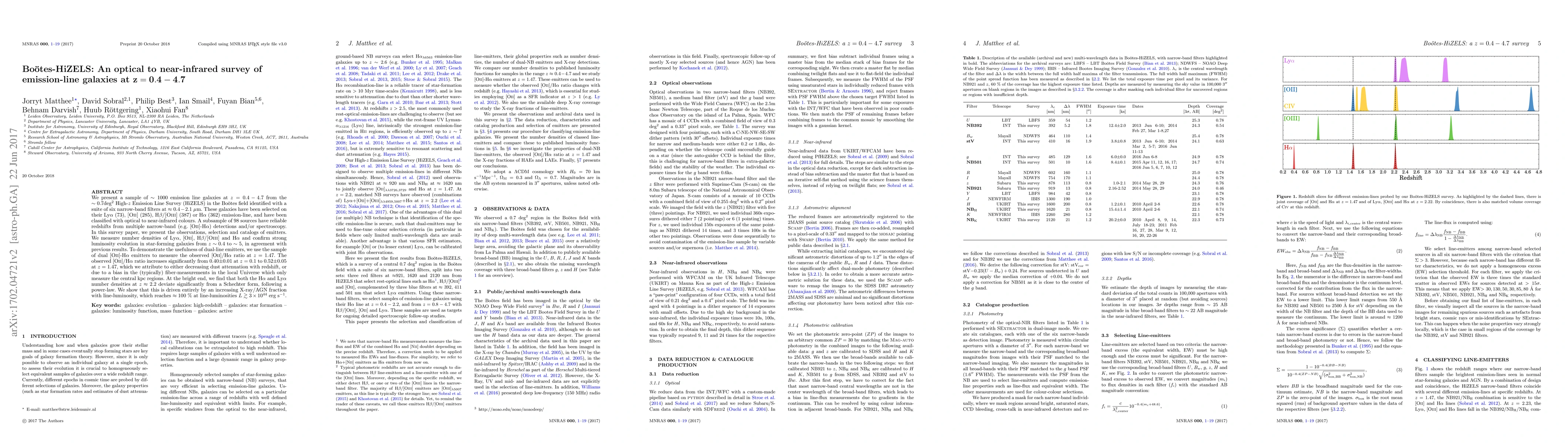 This paper presents a survey of ~1000 emission-line galaxies at redshifts $z=0.4-4.7$ from the HiZELS survey in the Boötes field, selected using narrow-band filters. It confirms strong luminosity evolution in star-forming galaxies and finds an increase in the [Oii]/Hα ratio from $z=0.1$ to $z=1.47$, likely due to decreasing dust attenuation or measurement biases.
