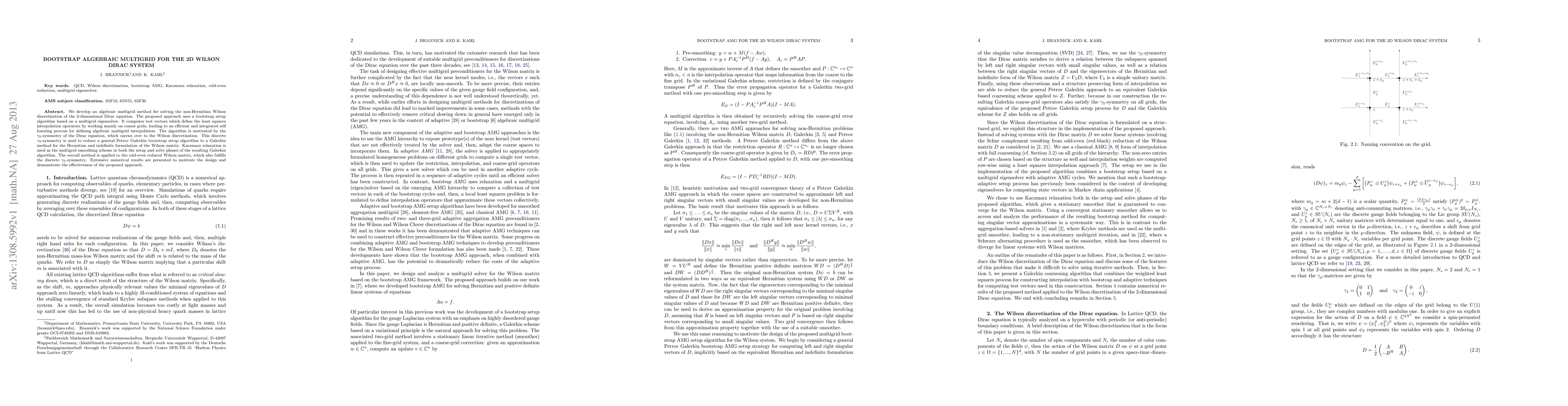 The paper develops an algebraic multigrid method for solving the 2D Wilson Dirac system, utilizing a bootstrap setup algorithm based on a multigrid eigensolver. It focuses on the non-Hermitian Wilson discretization, employing Kaczmarz relaxation as the smoothing scheme in both setup and solve phases.