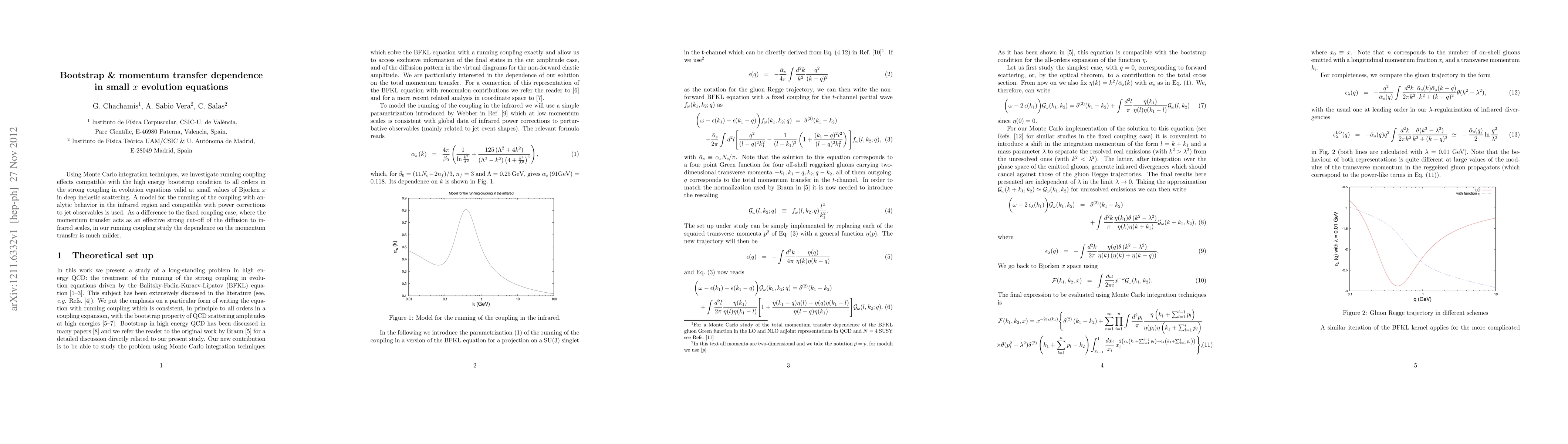 Using Monte Carlo integration techniques, we investigate running coupling effects compatible with the high energy bootstrap condition to all orders in the strong coupling in evolution equations valid at small values of Bjorken x in deep inelastic scattering. A model for the running of the coupling with analytic behavior in the infrared region and compatible with power corrections to jet observables is used. As a difference to the fixed coupling case, where the momentum transfer acts as an effective strong cut-off of the diffusion to infrared scales, in our running coupling study the dependence on the momentum transfer is much milder.