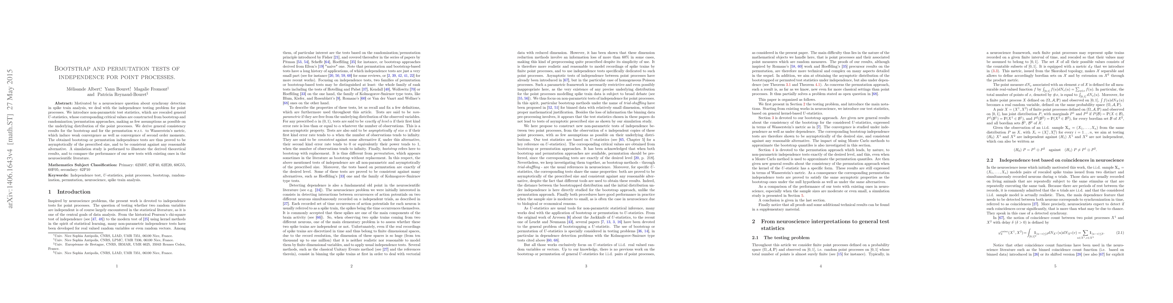 This paper develops non-parametric bootstrap and permutation tests for independence in point processes, motivated by neuroscience applications. The tests use rescaled $U$-statistics and achieve weak convergence and second-order moment convergence, proving asymptotic consistency and size control against general alternatives, validated by simulations.