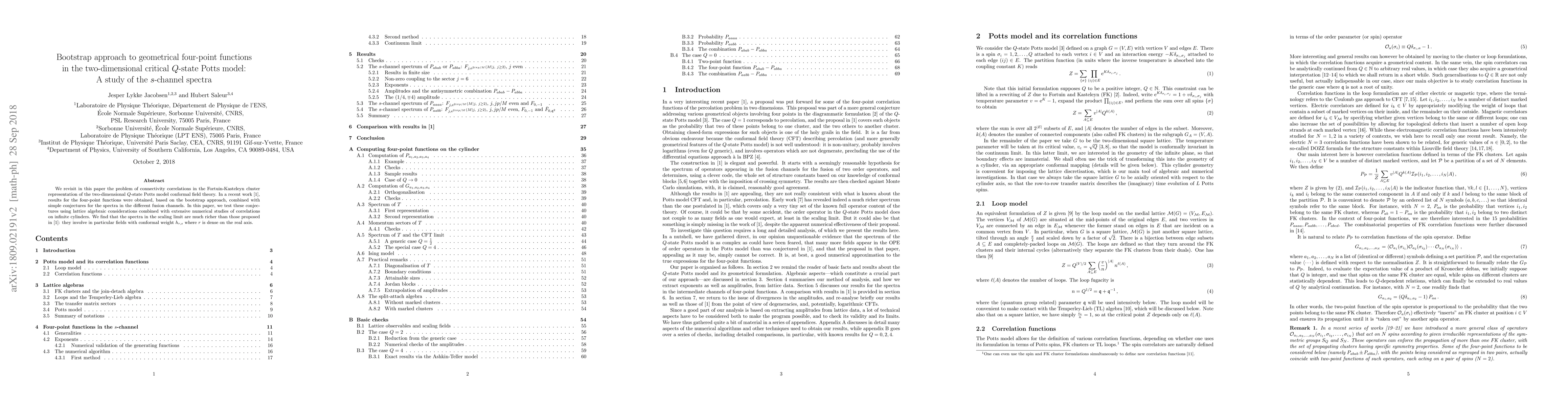 This paper examines the connectivity correlations in the two-dimensional $Q$-state Potts model using the bootstrap approach and lattice algebraic methods. It finds that the $s$-channel spectra are more complex than previously conjectured, revealing dense sets of fields with conformal weights.