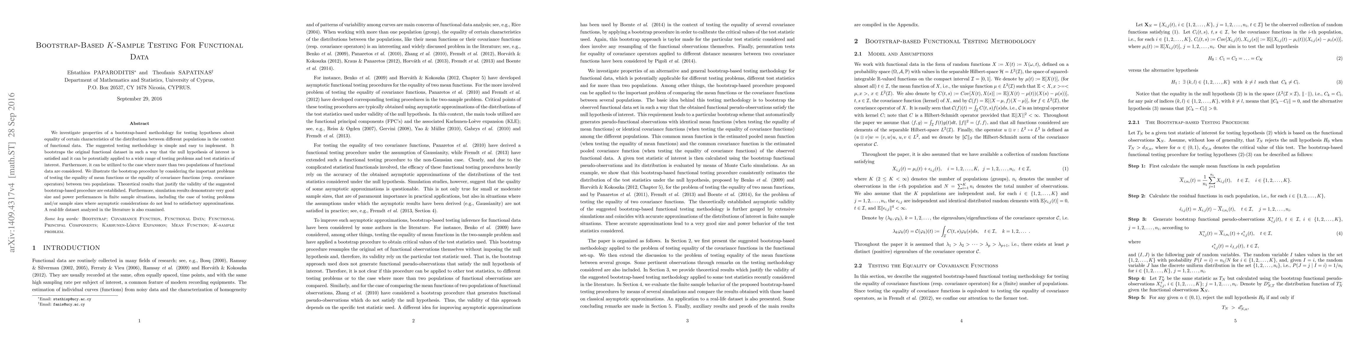 This paper proposes a bootstrap-based methodology for testing hypotheses about the equality of distribution characteristics between different populations in functional data. The method is simple, versatile, and effective, demonstrated through testing mean and covariance functions, with strong finite sample performance.