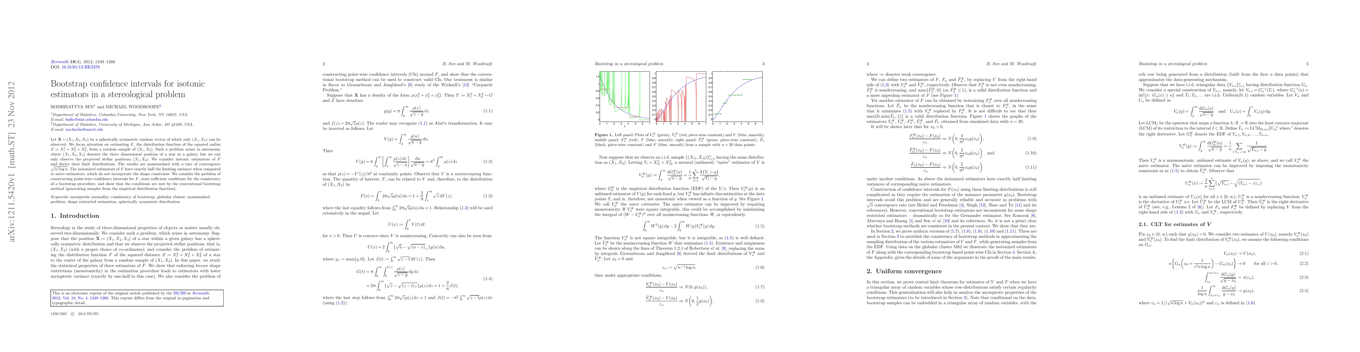 This paper develops isotonic estimators for the distribution function of a spherically symmetric random vector's squared radius, derived from observed projected positions. It establishes a bootstrap method for constructing confidence intervals, showing that the isotonized estimators have half the variance of naive estimators and that the bootstrap method is consistent.