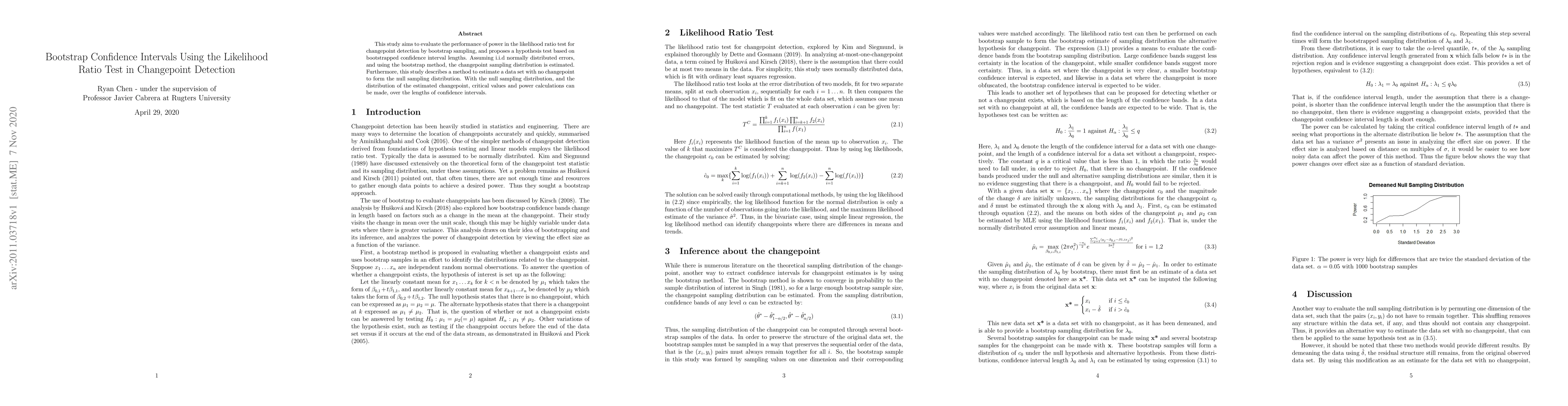This study evaluates the power of the likelihood ratio test for changepoint detection using bootstrap sampling and proposes a hypothesis test based on bootstrapped confidence interval lengths. It estimates the changepoint sampling distribution and the null sampling distribution to calculate critical values and power over confidence interval lengths.