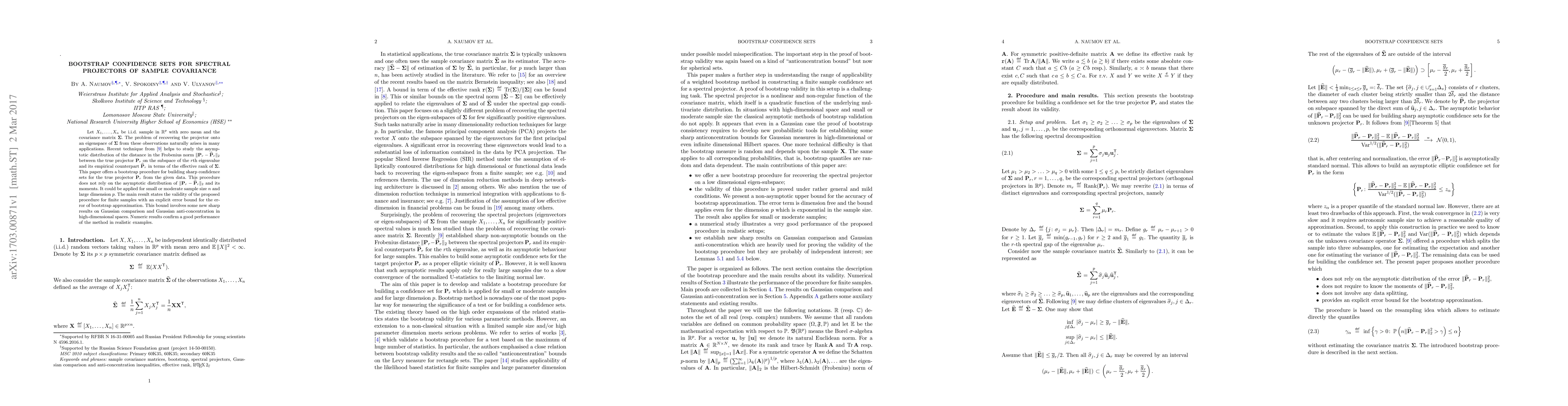 This paper proposes a bootstrap method for constructing confidence sets for spectral projectors of sample covariance matrices, applicable for small to moderate sample sizes and high dimensions. The method does not depend on asymptotic distributions, providing a valid procedure with an explicit error bound for finite samples.