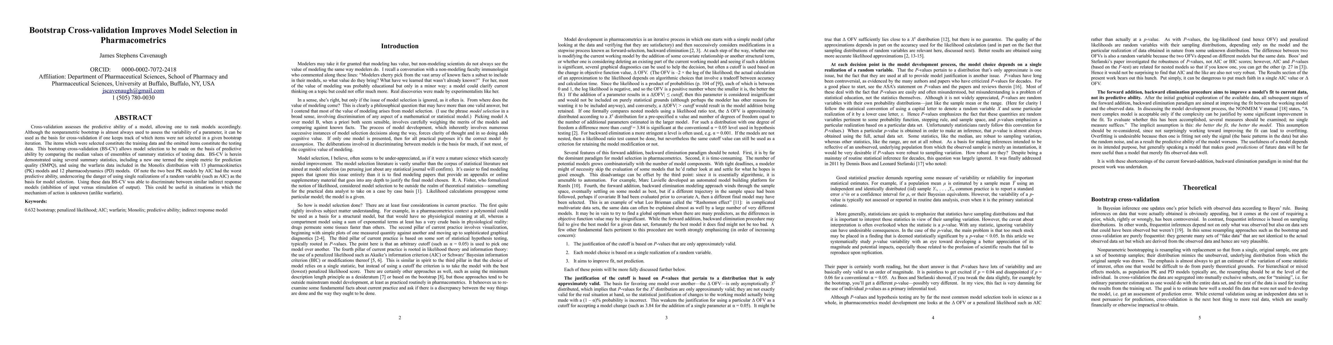 Cross-validation assesses the predictive ability of a model, allowing one to rank models accordingly. Although the nonparametric bootstrap is almost always used to assess the variability of a parameter, it can be used as the basis for cross-validation if one keeps track of which items were not selected in a given bootstrap iteration. The items which were selected constitute the training data and the omitted items constitute the testing data. This bootstrap cross-validation (BS-CV) allows model selection to be made on the basis of predictive ability by comparing the median values of ensembles of summary statistics of testing data. BS-CV is herein demonstrated using several summary statistics, including a new one termed the simple metric for prediction quality (SMPQ), and using the warfarin data included in the Monolix distribution with 13 pharmacokinetics (PK) models and 12 pharmacodynamics (PD) models. Of note the two best PK models by AIC had the worst predictive ability, underscoring the danger of using single realizations of a random variable (such as AIC) as the basis for model selection. Using these data BS-CV was able to discriminate between similar indirect response models (inhibition of input versus stimulation of output). This could be useful in situations in which the mechanism of action is unknown (unlike warfarin).