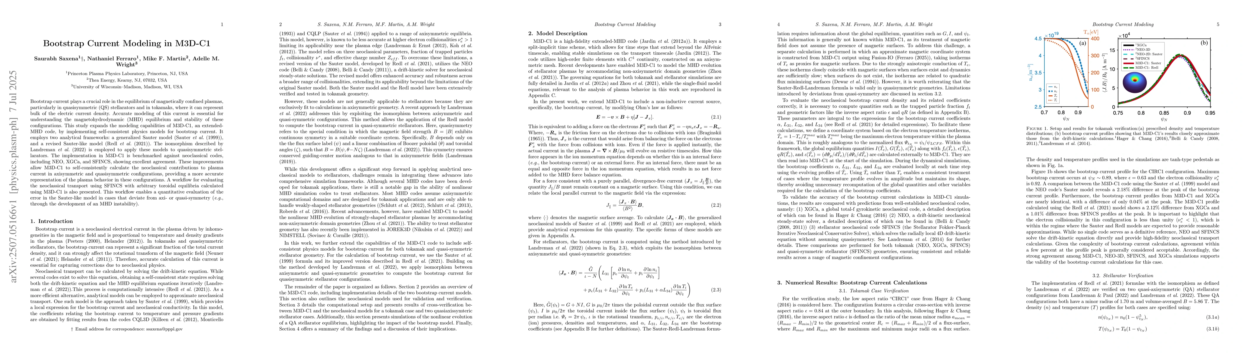 Bootstrap current plays a crucial role in the equilibrium of magnetically confined plasmas, particularly in quasisymmetric (QS) stellarators and in tokamaks, where it can represent bulk of the electric current density. Accurate modeling of this current is essential for understanding the magnetohydrodynamic (MHD) equilibrium and stability of these configurations. This study expands the modeling capabilities of M3D-C1, an extended-MHD code, by implementing self-consistent physics models for bootstrap current. It employs two analytical frameworks: a generalized Sauter model (Sauter et al. (1999)), and a revised Sauter-like model (Redl et al. (2021)). The isomorphism described by Landreman et al. (2022) is employed to apply these models to quasisymmetric stellarators. The implementation in M3D-C1 is benchmarked against neoclassical codes, including NEO, XGCa, and SFINCS, showing excellent agreement. These improvements allow M3D-C1 to self-consistently calculate the neoclassical contributions to plasma current in axisymmetric and quasisymmetric configurations, providing a more accurate representation of the plasma behavior in these configurations. A workflow for evaluating the neoclassical transport using SFINCS with arbitrary toroidal equilibria calculated using M3D-C1 is also presented. This workflow enables a quantitative evaluation of the error in the Sauter-like model in cases that deviate from axi- or quasi-symmetry (e.g., through the development of an MHD instability).