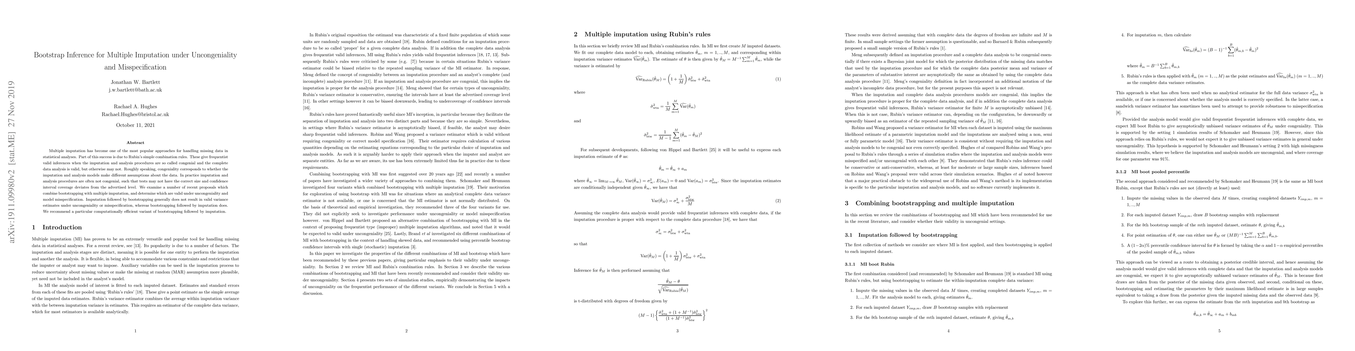 The paper examines the validity of combining bootstrapping with multiple imputation (MI) under uncongeniality and model misspecification, contrasting approaches that first impute then bootstrap with those that bootstrap followed by imputation.
