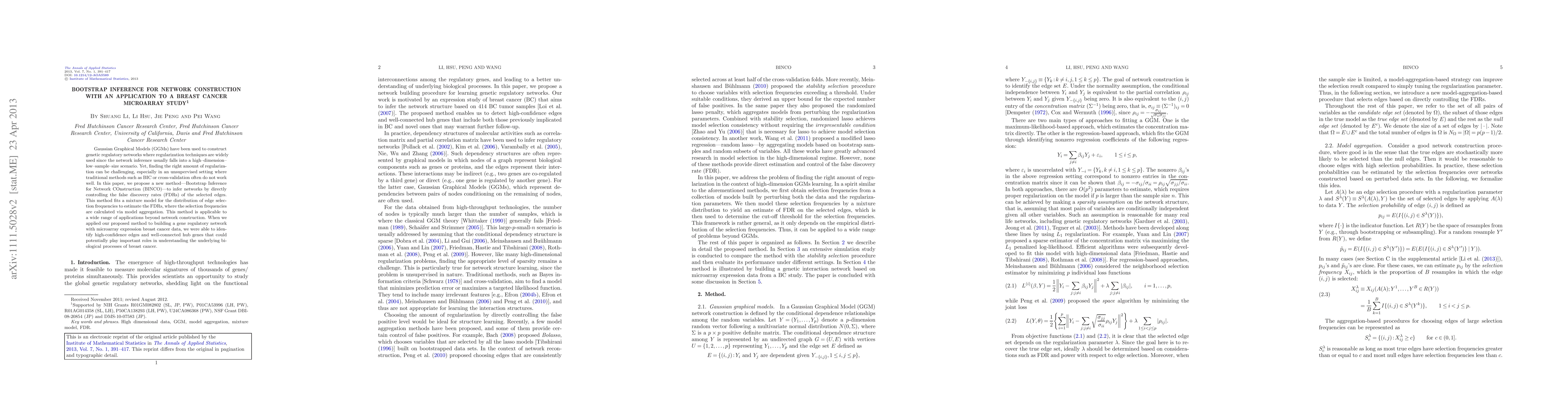 Gaussian Graphical Models (GGMs) have been used to construct genetic regulatory networks where regularization techniques are widely used since the network inference usually falls into a high-dimension-low-sample-size scenario. Yet, finding the right amount of regularization can be challenging, especially in an unsupervised setting where traditional methods such as BIC or cross-validation often do not work well. In this paper, we propose a new method - Bootstrap Inference for Network COnstruction (BINCO) - to infer networks by directly controlling the false discovery rates (FDRs) of the selected edges. This method fits a mixture model for the distribution of edge selection frequencies to estimate the FDRs, where the selection frequencies are calculated via model aggregation. This method is applicable to a wide range of applications beyond network construction. When we applied our proposed method to building a gene regulatory network with microarray expression breast cancer data, we were able to identify high-confidence edges and well-connected hub genes that could potentially play important roles in understanding the underlying biological processes of breast cancer.