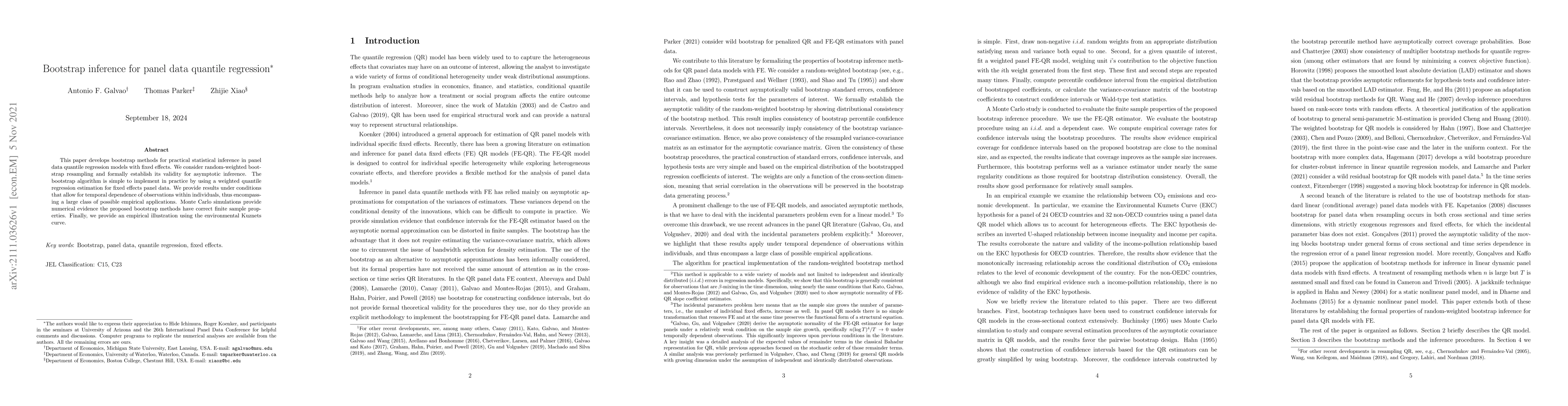 This paper introduces bootstrap methods for statistical inference in panel data quantile regression models with fixed effects, establishing the validity of random-weighted bootstrap resampling for asymptotic inference. The proposed method is practical and effective, even under temporal dependence, as demonstrated by Monte Carlo simulations and an empirical application to the environmental Kuznets curve.