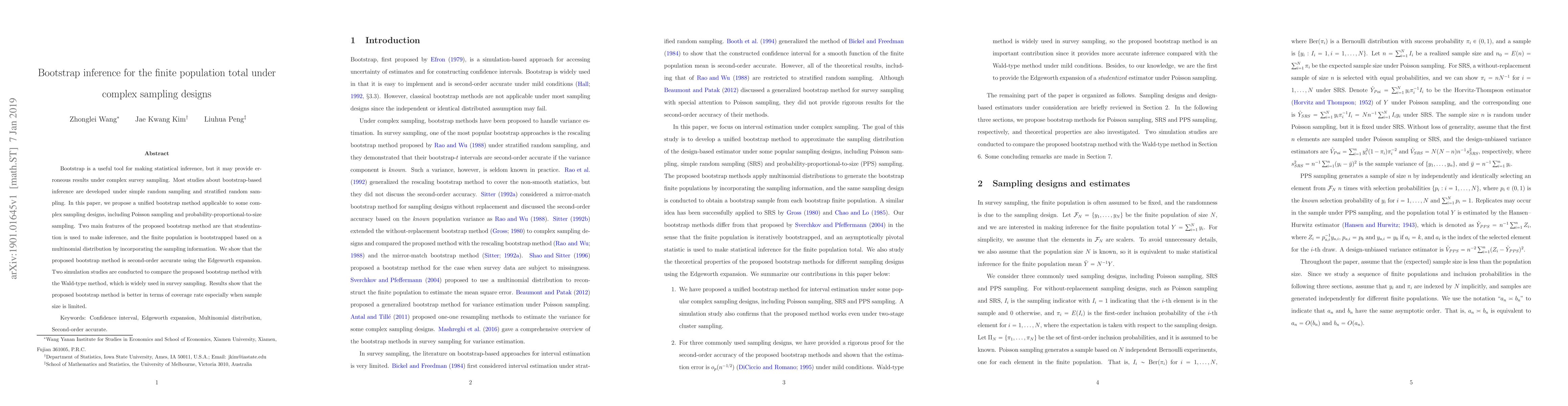 This paper proposes a unified bootstrap method for making accurate statistical inference under complex sampling designs, such as Poisson and probability-proportional-to-size sampling. The method uses studentization and a multinomial distribution to incorporate sampling information, demonstrating second-order accuracy and superior coverage rates compared to the Wald-type method, especially with limited sample sizes.