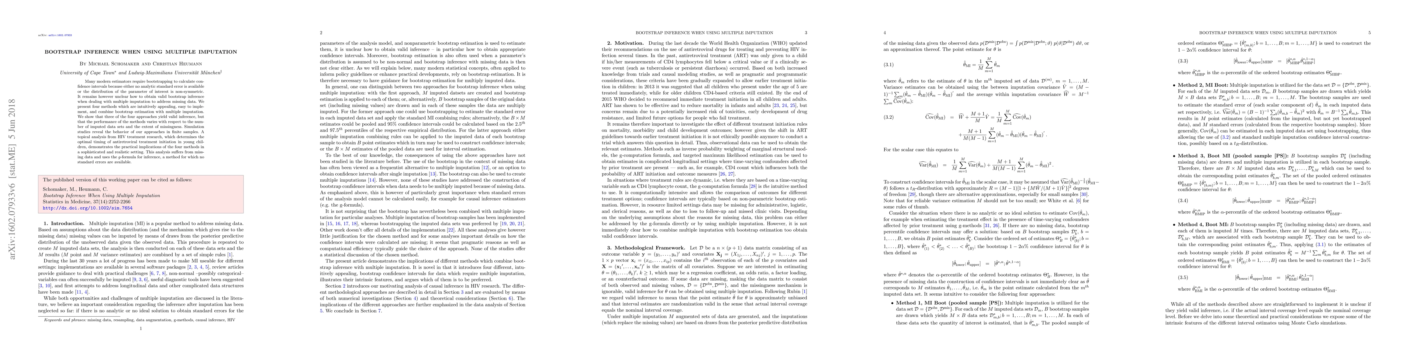 This paper proposes four methods for bootstrap inference in the context of multiple imputation for missing data, demonstrating that three of them yield valid results. The performance of these methods varies based on the number of imputed datasets and the extent of missingness, as shown through simulation studies and a practical application in HIV treatment research.