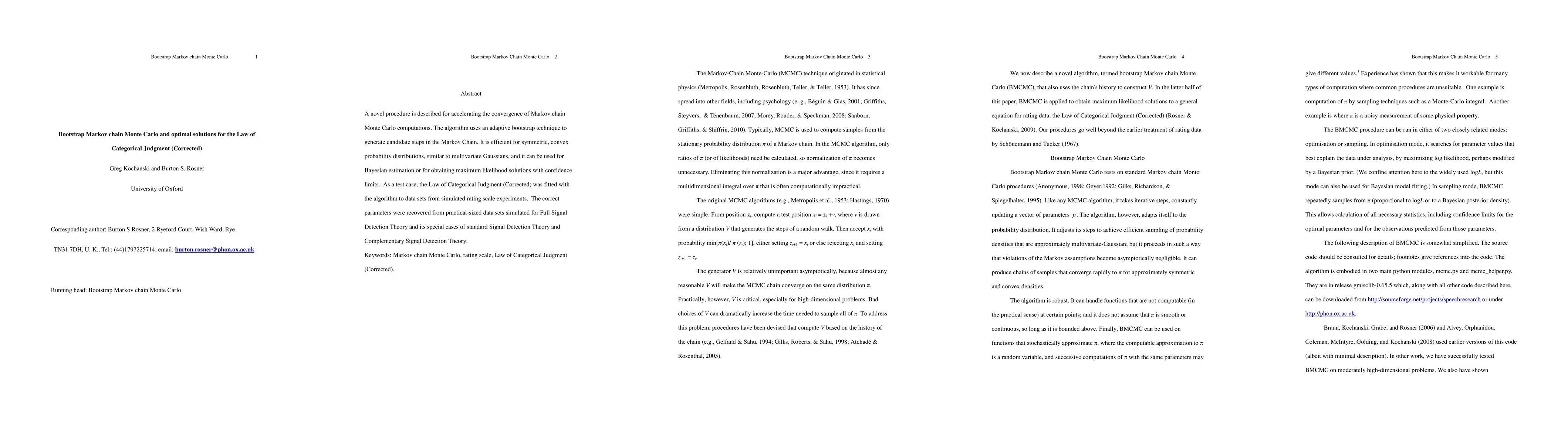 A novel procedure is described for accelerating the convergence of Markov chain Monte Carlo computations. The algorithm uses an adaptive bootstrap technique to generate candidate steps in the Markov Chain. It is efficient for symmetric, convex probability distributions, similar to multivariate Gaussians, and it can be used for Bayesian estimation or for obtaining maximum likelihood solutions with confidence limits. As a test case, the Law of Categorical Judgment (Corrected) was fitted with the algorithm to data sets from simulated rating scale experiments. The correct parameters were recovered from practical-sized data sets simulated for Full Signal Detection Theory and its special cases of standard Signal Detection Theory and Complementary Signal Detection Theory.