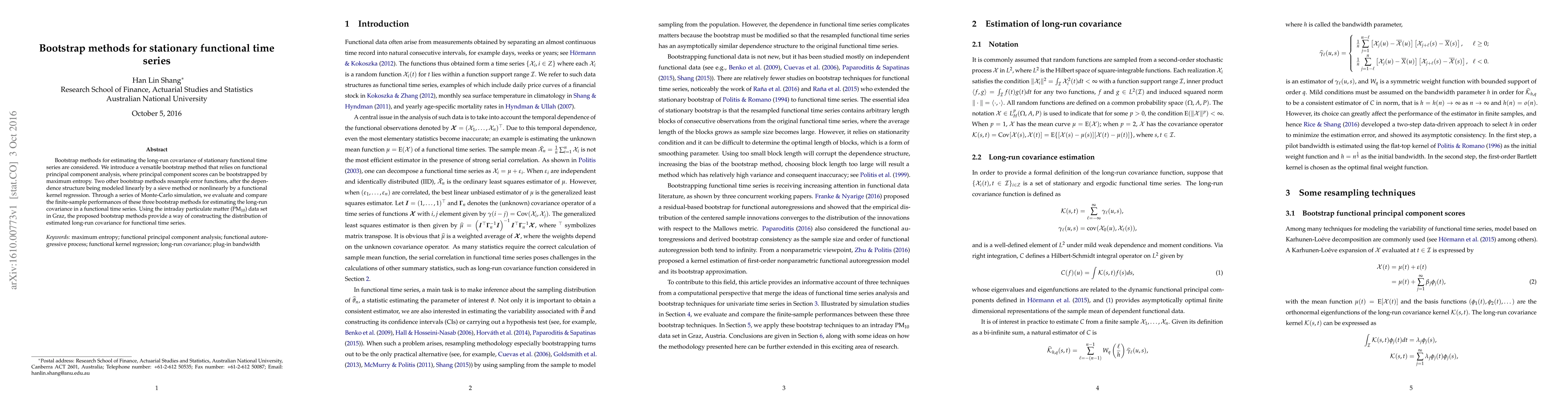 Bootstrap methods for estimating the long-run covariance of stationary functional time series are considered. We introduce a versatile bootstrap method that relies on functional principal component analysis, where principal component scores can be bootstrapped by maximum entropy. Two other bootstrap methods resample error functions, after the dependence structure being modeled linearly by a sieve method or nonlinearly by a functional kernel regression. Through a series of Monte-Carlo simulation, we evaluate and compare the finite-sample performances of these three bootstrap methods for estimating the long-run covariance in a functional time series. Using the intraday particulate matter (PM10) data set in Graz, the proposed bootstrap methods provide a way of constructing the distribution of estimated long-run covariance for functional time series.