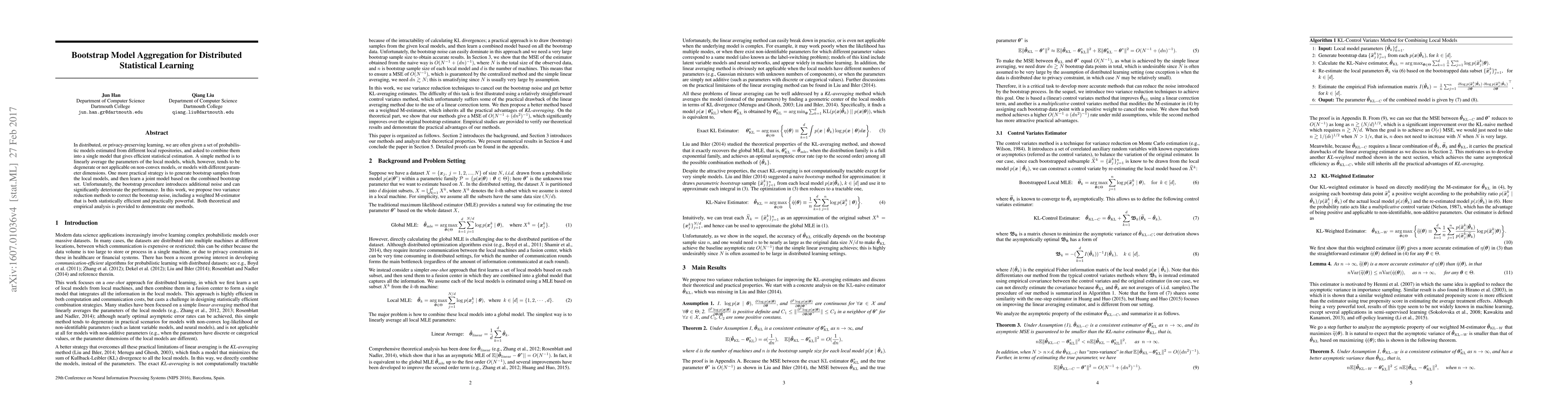 In distributed, or privacy-preserving learning, we are often given a set of probabilistic models estimated from different local repositories, and asked to combine them into a single model that gives efficient statistical estimation. A simple method is to linearly average the parameters of the local models, which, however, tends to be degenerate or not applicable on non-convex models, or models with different parameter dimensions. One more practical strategy is to generate bootstrap samples from the local models, and then learn a joint model based on the combined bootstrap set. Unfortunately, the bootstrap procedure introduces additional noise and can significantly deteriorate the performance. In this work, we propose two variance reduction methods to correct the bootstrap noise, including a weighted M-estimator that is both statistically efficient and practically powerful. Both theoretical and empirical analysis is provided to demonstrate our methods.