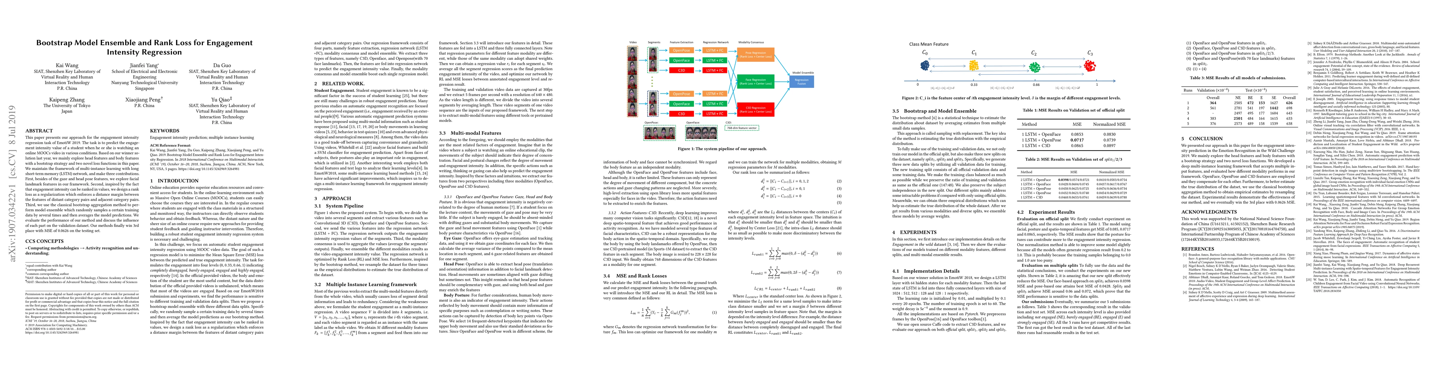 This paper proposes a method for predicting engagement intensity in online video learners using head, body, and facial landmark features, enhanced by a rank loss function and bootstrap model ensemble, achieving 3rd place in the EmotiW 2019 competition with a test MSE of 0.0626.