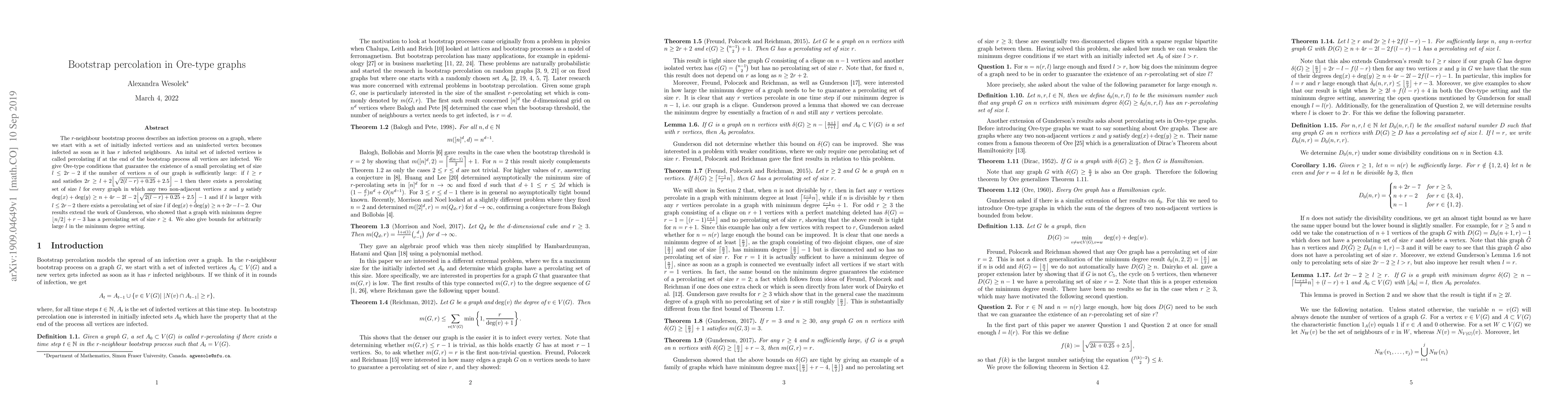 This paper investigates the $r$-neighbour bootstrap percolation in Ore-type graphs, establishing conditions for the existence of small percolating sets of size $l \leq 2r-2$ when the graph's minimum degree condition is met. It extends previous results by providing more general bounds for large $l$ and improving understanding of infection spread in such graphs.