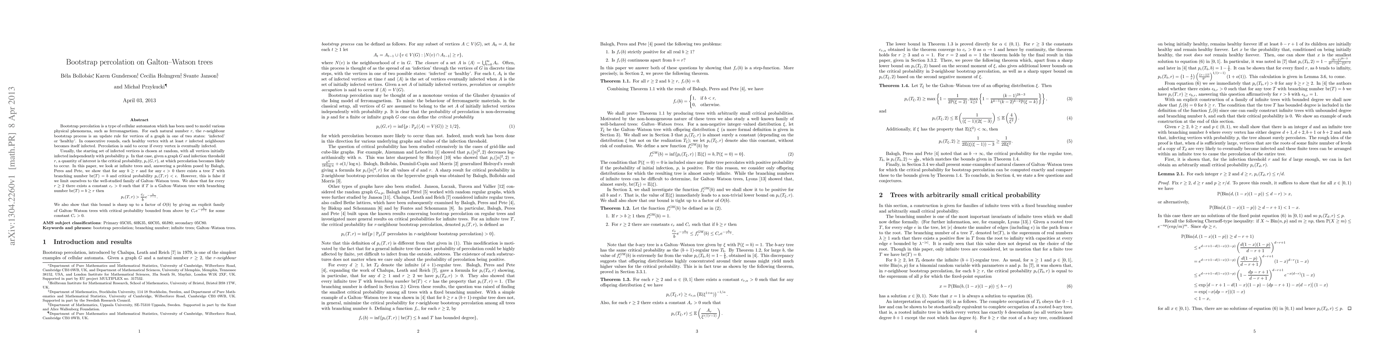 Bootstrap percolation is a type of cellular automaton which has been used to model various physical phenomena, such as ferromagnetism. For each natural number $r$, the $r$-neighbour bootstrap process is an update rule for vertices of a graph in one of two states: `infected' or `healthy'. In consecutive rounds, each healthy vertex with at least $r$ infected neighbours becomes itself infected. Percolation is said to occur if every vertex is eventually infected. Usually, the starting set of infected vertices is chosen at random, with all vertices initially infected independently with probability $p$. In that case, given a graph $G$ and infection threshold $r$, a quantity of interest is the critical probability, $p_c(G,r)$, at which percolation becomes likely to occur. In this paper, we look at infinite trees and, answering a problem posed by Balogh, Peres and Pete, we show that for any $b \geq r$ and for any $\epsilon > 0$ there exists a tree $T$ with branching number $\br(T) = b$ and critical probability $p_c(T,r) < \epsilon$. However, this is false if we limit ourselves to the well-studied family of Galton--Watson trees. We show that for every $r \geq 2$ there exists a constant $c_r>0$ such that if $T$ is a Galton--Watson tree with branching number $\br(T) = b \geq r$ then p_c(T,r) > \frac{c_r}{b} e^{-\frac{b}{r-1}}. We also show that this bound is sharp up to a factor of $O(b)$ by giving an explicit family of Galton--Watson trees with critical probability bounded from above by $C_r e^{-\frac{b}{r-1}}$ for some constant $C_r>0$.
