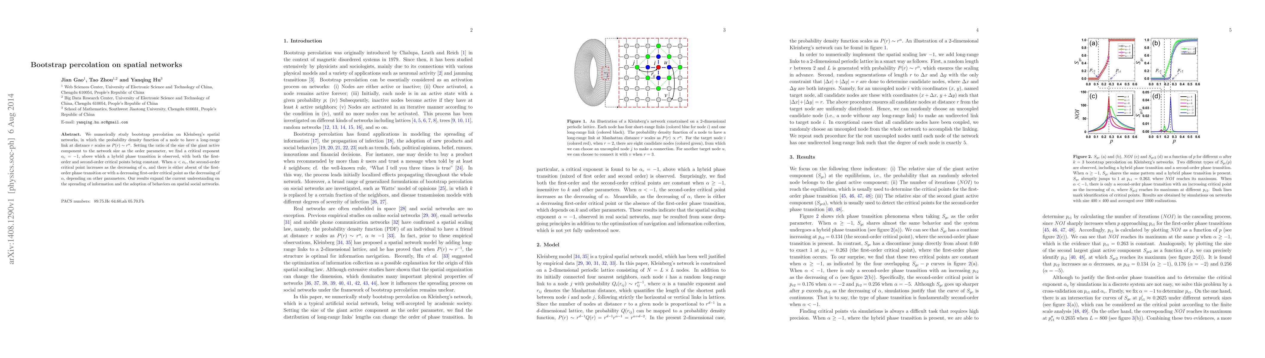 This paper investigates bootstrap percolation on Kleinberg's spatial networks, revealing a critical exponent $\alpha_{c}=-1$ that marks a hybrid phase transition. When $\alpha>\alpha_{c}$, the system exhibits both first-order and second-order critical points, while for $\alpha<\alpha_{c}$ the second-order critical point increases, and the first-order transition either diminishes or vanishes.