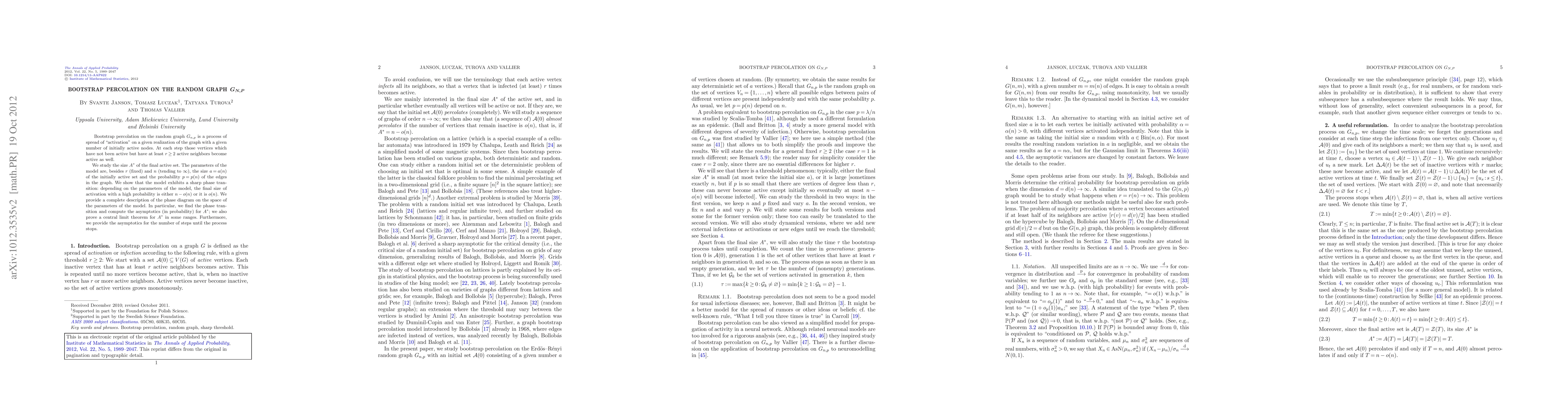 Bootstrap percolation on the random graph $G_{n,p}$ is a process of spread of "activation" on a given realization of the graph with a given number of initially active nodes. At each step those vertices which have not been active but have at least $r\geq2$ active neighbors become active as well. We study the size $A^*$ of the final active set. The parameters of the model are, besides $r$ (fixed) and $n$ (tending to $\infty$), the size $a=a(n)$ of the initially active set and the probability $p=p(n)$ of the edges in the graph. We show that the model exhibits a sharp phase transition: depending on the parameters of the model, the final size of activation with a high probability is either $n-o(n)$ or it is $o(n)$. We provide a complete description of the phase diagram on the space of the parameters of the model. In particular, we find the phase transition and compute the asymptotics (in probability) for $A^*$; we also prove a central limit theorem for $A^*$ in some ranges. Furthermore, we provide the asymptotics for the number of steps until the process stops.