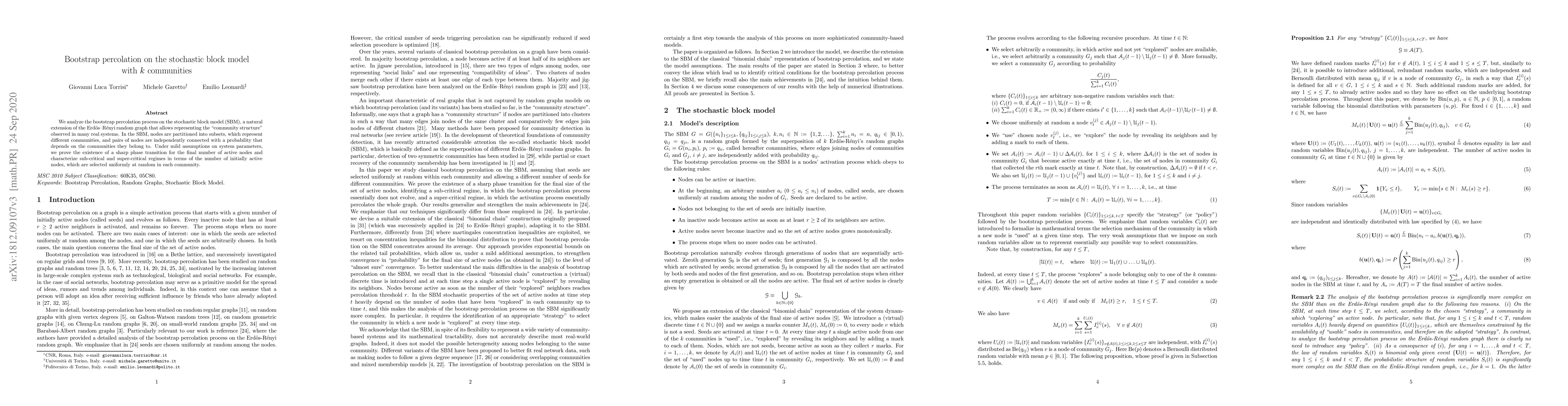 This paper investigates the bootstrap percolation process on the stochastic block model, revealing a sharp phase transition in the number of active nodes based on initial activation probabilities. It characterizes both sub-critical and super-critical regimes in terms of the number of initially active nodes selected uniformly within communities.