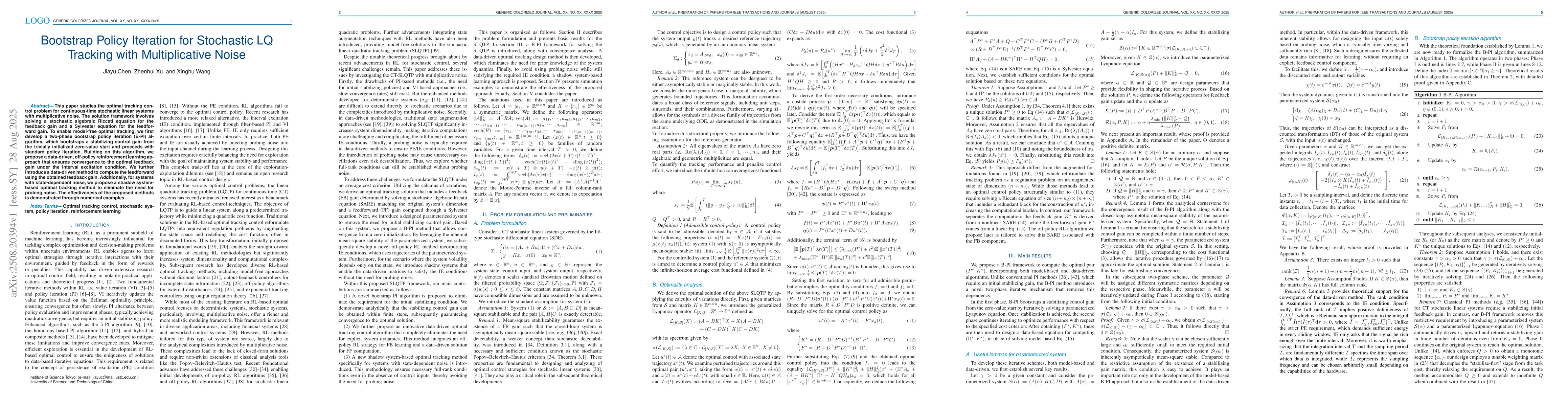 This paper studies the optimal tracking control problem for continuous-time stochastic linear systems with multiplicative noise. The solution framework involves solving a stochastic algebraic Riccati equation for the feedback gain and a Sylvester equation for the feedforward gain. To enable model-free optimal tracking, we first develop a two-phase bootstrap policy iteration (B-PI) algorithm, which bootstraps a stabilizing control gain from the trivially initialized zero-value start and proceeds with standard policy iteration. Building on this algorithm, we propose a data-driven, off-policy reinforcement learning approach that ensures convergence to the optimal feedback gain under the interval excitation condition. We further introduce a data-driven method to compute the feedforward using the obtained feedback gain. Additionally, for systems with state-dependent noise, we propose a shadow system-based optimal tracking method to eliminate the need for probing noise. The effectiveness of the proposed methods is demonstrated through numerical examples.