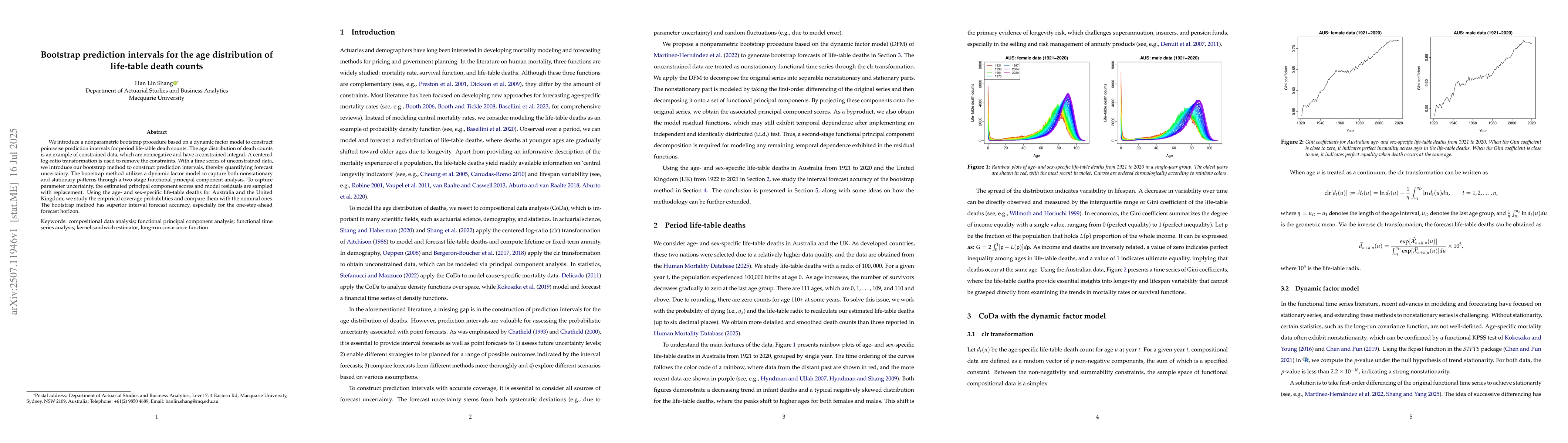 We introduce a nonparametric bootstrap procedure based on a dynamic factor model to construct pointwise prediction intervals for period life-table death counts. The age distribution of death counts is an example of constrained data, which are nonnegative and have a constrained integral. A centered log-ratio transformation is used to remove the constraints. With a time series of unconstrained data, we introduce our bootstrap method to construct prediction intervals, thereby quantifying forecast uncertainty. The bootstrap method utilizes a dynamic factor model to capture both nonstationary and stationary patterns through a two-stage functional principal component analysis. To capture parameter uncertainty, the estimated principal component scores and model residuals are sampled with replacement. Using the age- and sex-specific life-table deaths for Australia and the United Kingdom, we study the empirical coverage probabilities and compare them with the nominal ones. The bootstrap method has superior interval forecast accuracy, especially for the one-step-ahead forecast horizon.