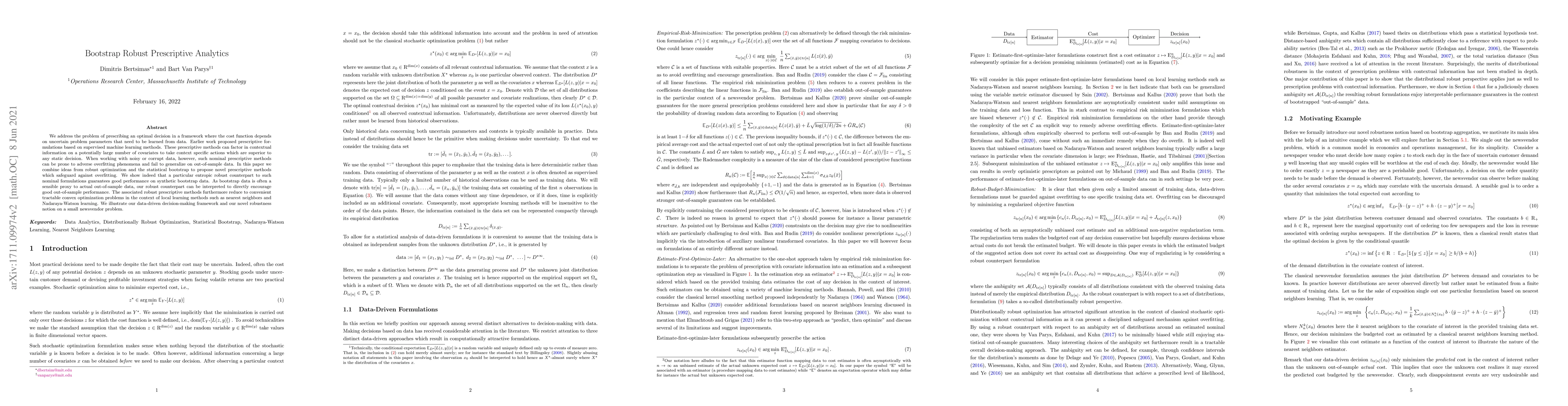 This paper proposes robust prescriptive analytics methods combining robust optimization and bootstrap techniques to mitigate overfitting in decision-making frameworks with uncertain parameters. The novel entropic robust formulations ensure good out-of-sample performance and are tractable as convex optimization problems.