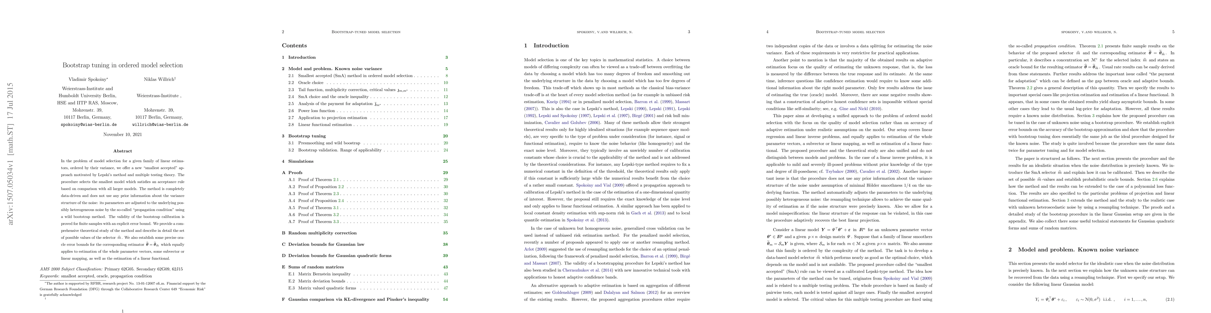 This research paper introduces a new method for model selection that uses a bootstrap tuning approach to select the smallest model satisfying an acceptance rule based on comparison with larger models. The method provides a data-driven approach without prior knowledge of variance structure and establishes error bounds for its estimator.