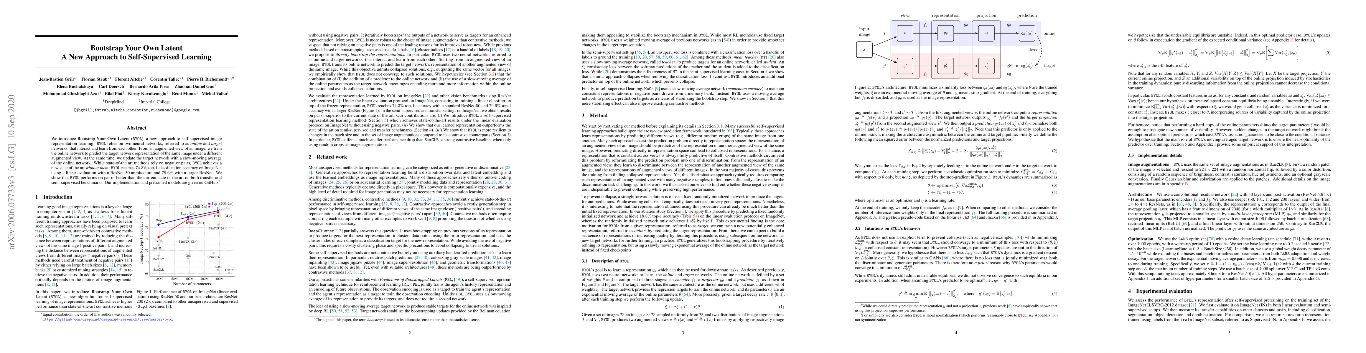 We introduce Bootstrap Your Own Latent (BYOL), a new approach to self-supervised image representation learning. BYOL relies on two neural networks, referred to as online and target networks, that interact and learn from each other. From an augmented view of an image, we train the online network to predict the target network representation of the same image under a different augmented view. At the same time, we update the target network with a slow-moving average of the online network. While state-of-the art methods rely on negative pairs, BYOL achieves a new state of the art without them. BYOL reaches $74.3\%$ top-1 classification accuracy on ImageNet using a linear evaluation with a ResNet-50 architecture and $79.6\%$ with a larger ResNet. We show that BYOL performs on par or better than the current state of the art on both transfer and semi-supervised benchmarks. Our implementation and pretrained models are given on GitHub.