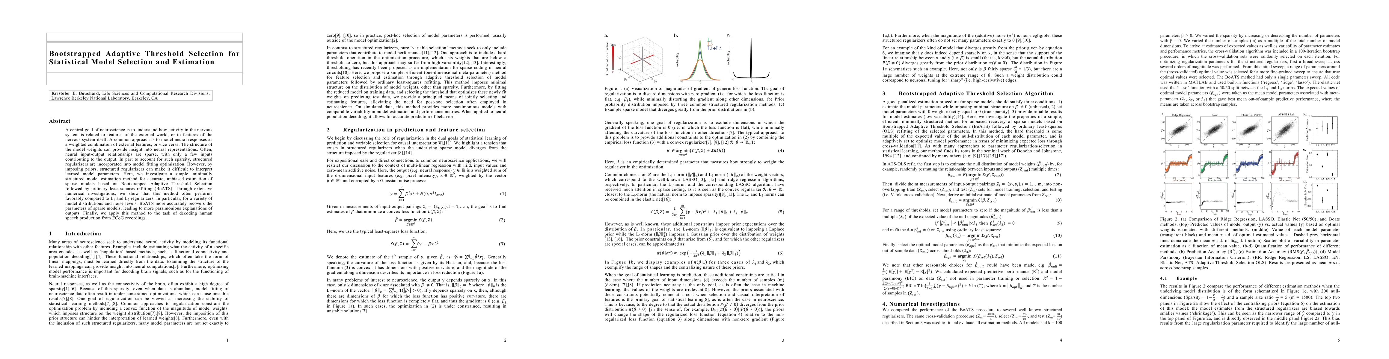 A central goal of neuroscience is to understand how activity in the nervous system is related to features of the external world, or to features of the nervous system itself. A common approach is to model neural responses as a weighted combination of external features, or vice versa. The structure of the model weights can provide insight into neural representations. Often, neural input-output relationships are sparse, with only a few inputs contributing to the output. In part to account for such sparsity, structured regularizers are incorporated into model fitting optimization. However, by imposing priors, structured regularizers can make it difficult to interpret learned model parameters. Here, we investigate a simple, minimally structured model estimation method for accurate, unbiased estimation of sparse models based on Bootstrapped Adaptive Threshold Selection followed by ordinary least-squares refitting (BoATS). Through extensive numerical investigations, we show that this method often performs favorably compared to L1 and L2 regularizers. In particular, for a variety of model distributions and noise levels, BoATS more accurately recovers the parameters of sparse models, leading to more parsimonious explanations of outputs. Finally, we apply this method to the task of decoding human speech production from ECoG recordings.