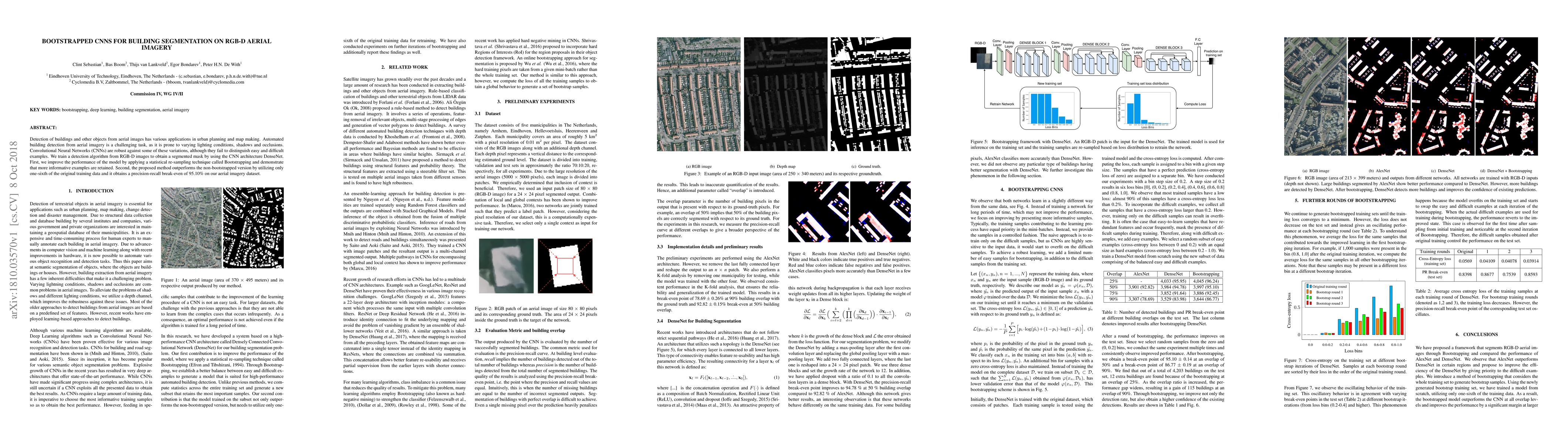 This paper proposes a Bootstrapped CNN using DenseNet for building segmentation in RGB-D aerial imagery, achieving a precision-recall break-even of 95.10% while requiring only one-sixth of the original training data, demonstrating improved performance through statistical re-sampling.