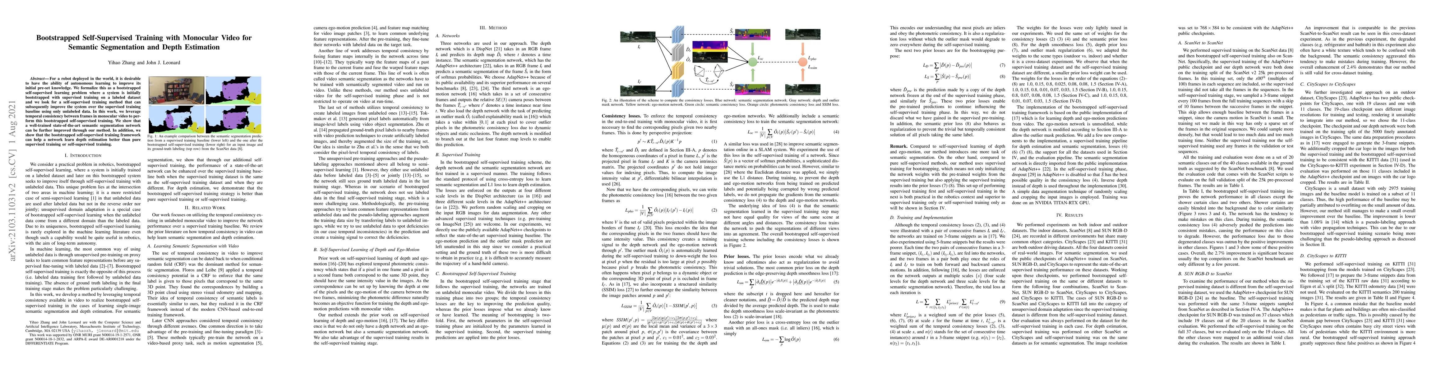 This paper proposes a bootstrapped self-supervised learning method using monocular video to enhance semantic segmentation and depth estimation in robots. It leverages temporal consistency across video frames to improve a pre-trained network beyond its supervised training baseline using only unlabeled data.