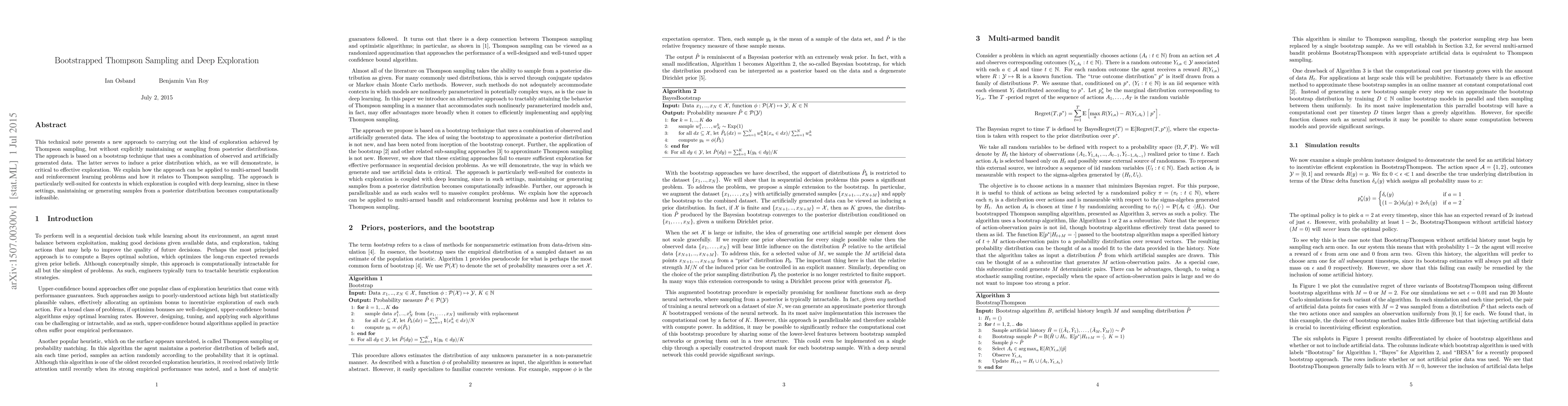 This technical note presents a new approach to carrying out the kind of exploration achieved by Thompson sampling, but without explicitly maintaining or sampling from posterior distributions. The approach is based on a bootstrap technique that uses a combination of observed and artificially generated data. The latter serves to induce a prior distribution which, as we will demonstrate, is critical to effective exploration. We explain how the approach can be applied to multi-armed bandit and reinforcement learning problems and how it relates to Thompson sampling. The approach is particularly well-suited for contexts in which exploration is coupled with deep learning, since in these settings, maintaining or generating samples from a posterior distribution becomes computationally infeasible.