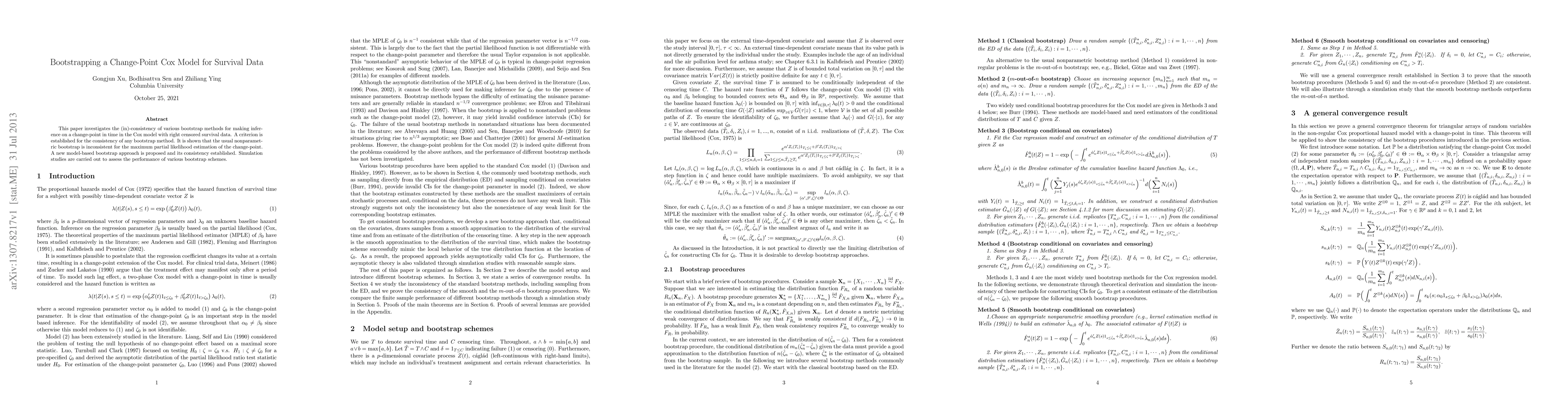 This paper investigates the (in)-consistency of various bootstrap methods for making inference on a change-point in time in the Cox model with right censored survival data. A criterion is established for the consistency of any bootstrap method. It is shown that the usual nonparametric bootstrap is inconsistent for the maximum partial likelihood estimation of the change-point. A new model-based bootstrap approach is proposed and its consistency established. Simulation studies are carried out to assess the performance of various bootstrap schemes.