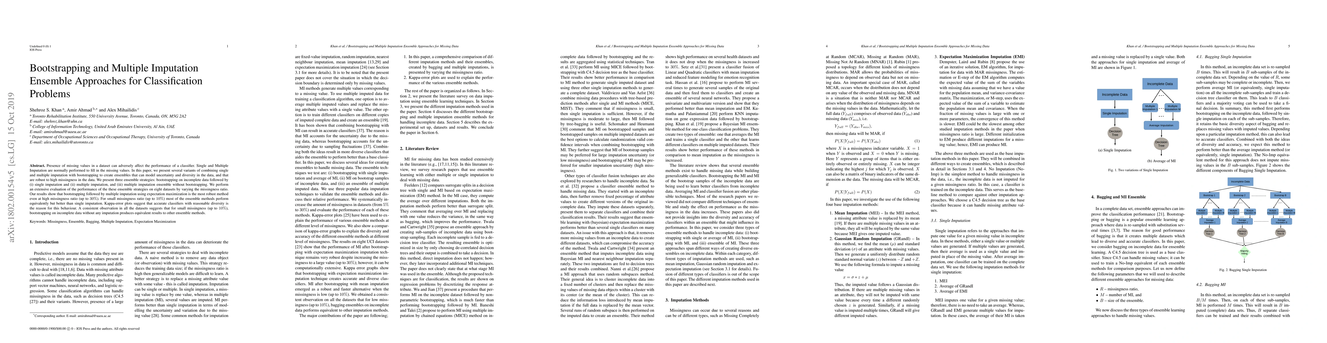 This paper explores ensemble approaches combining bootstrapping and multiple imputation to address missing data issues in classifiers. The study finds that bootstrapping followed by multiple imputation is most robust, especially at high missingness ratios, while bootstrapping alone can be effective for small missingness levels.