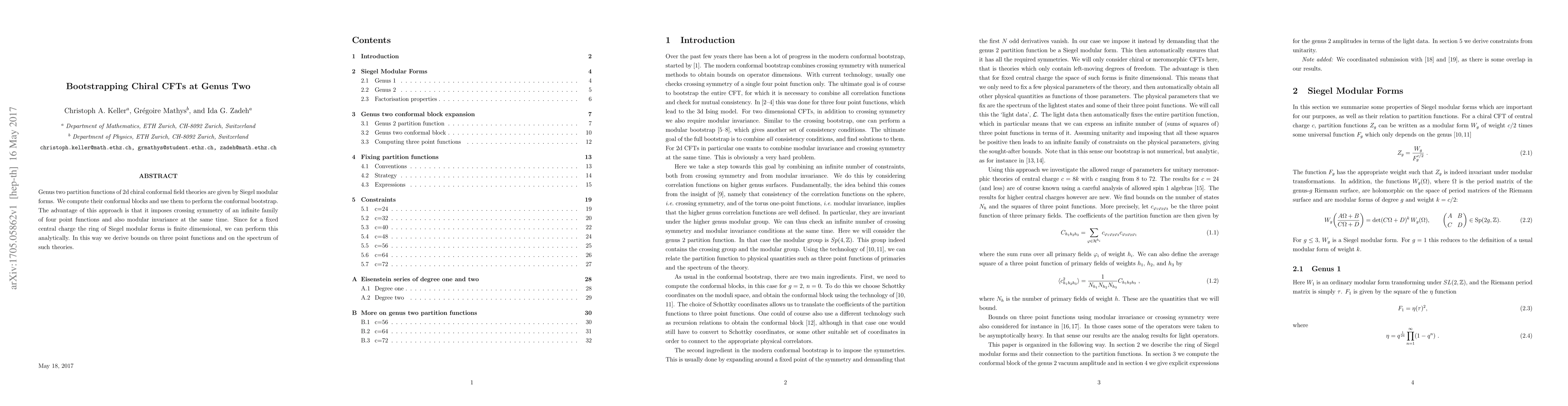 This paper computes genus two partition functions of 2d chiral conformal field theories using Siegel modular forms, performing conformal bootstrap to derive bounds on three-point functions and the spectrum, leveraging crossing symmetry and modular invariance.