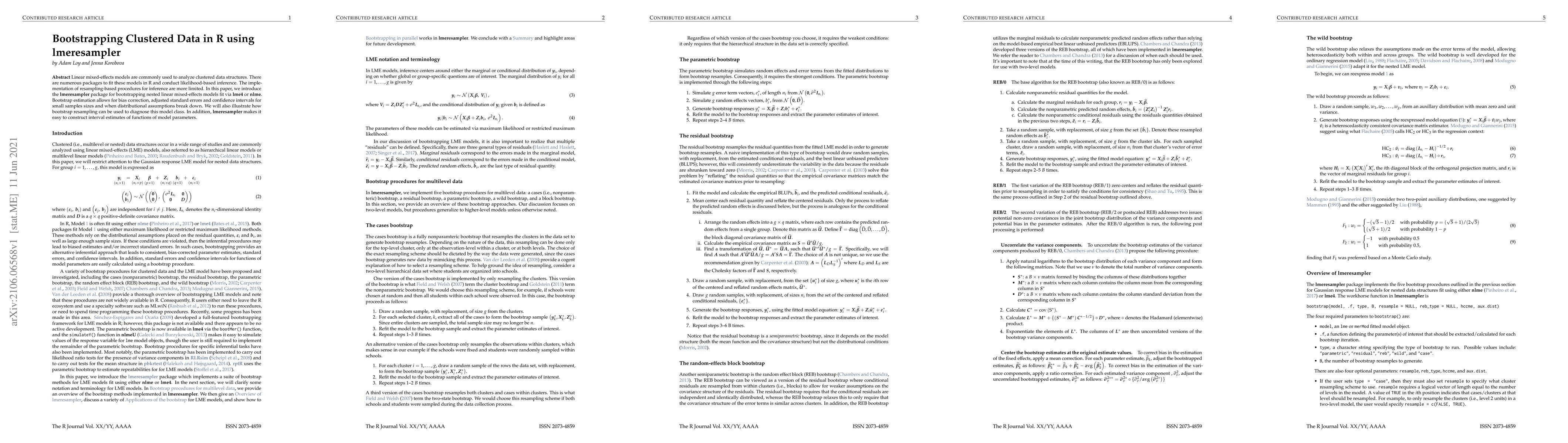 This paper introduces the lmeresampler package for bootstrapping linear mixed-effects models in R, enabling bias correction, adjusted standard errors, and confidence intervals for clustered data analysis. It also facilitates model diagnostics and interval estimates of model parameters.